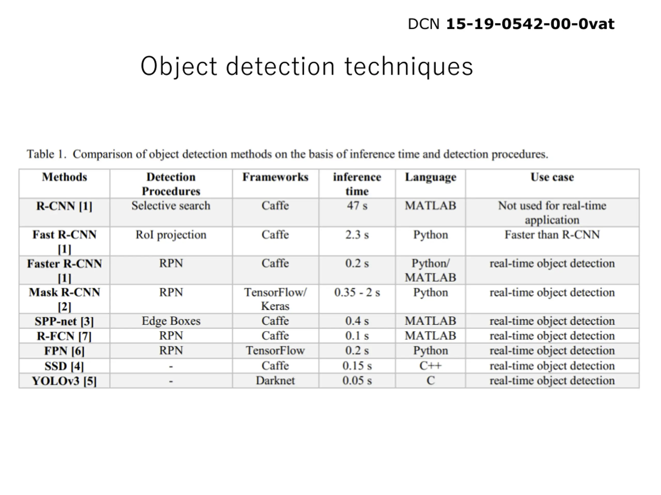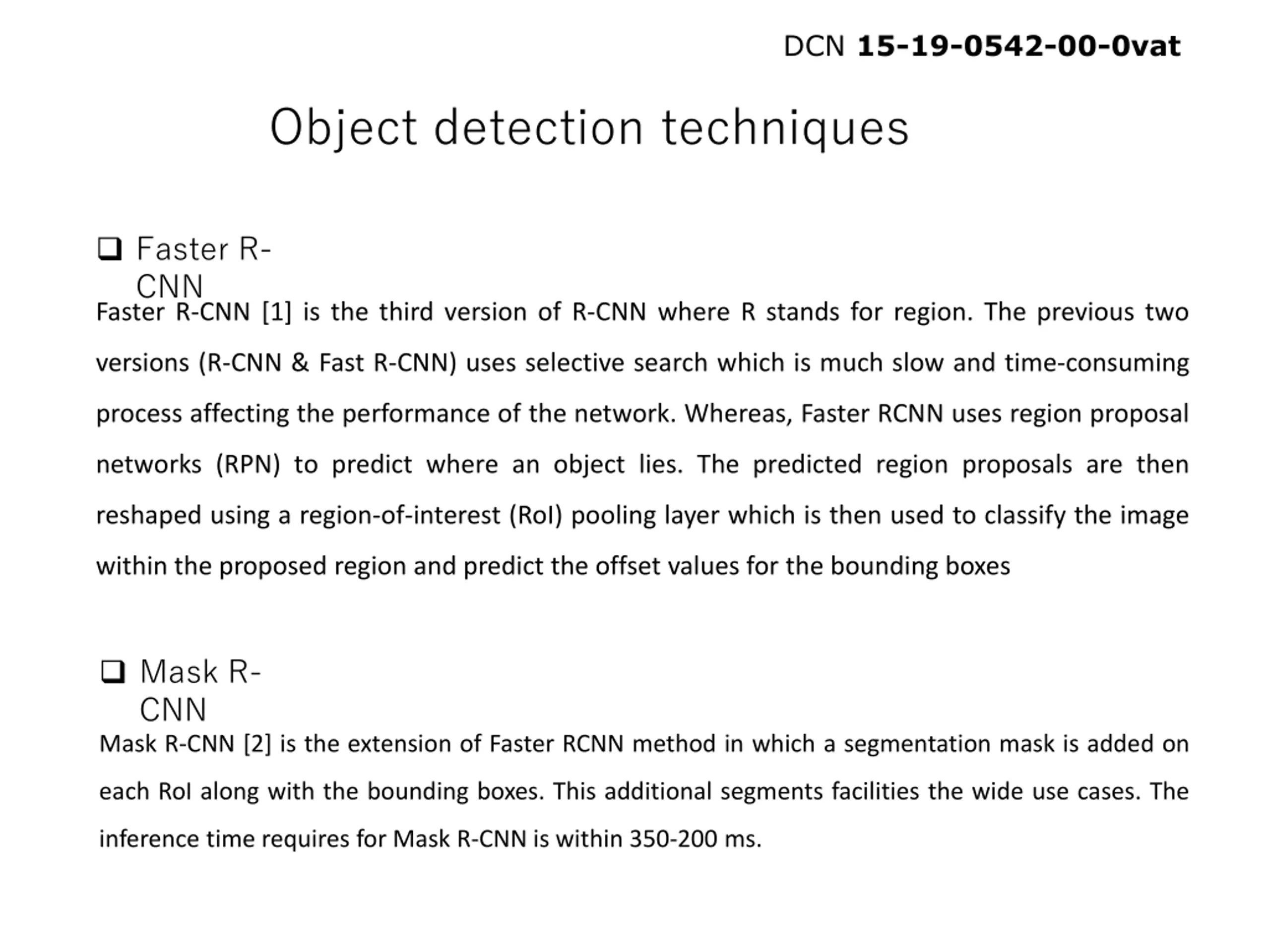 DCN 15-19-0542-00-0vat Object detection techniques Faster R- CNN Faster R-CNN [1] is the third version of R-CNN where R stands for region. The previous two versions (R-CNN & Fast R-CNN) uses selective search which is much slow and time-consuming process affecting the performance of the network. Whereas, Faster RCNN uses region proposal networks (RPN) to predict where an object lies. The predicted region proposals are then reshaped using a region-of-interest (RoI) pooling layer which is then used to classify the image within the proposed region and predict the offset values for the bounding boxes Mask R- CNN Mask R-CNN [2] is the extension of Faster RCNN method in which a segmentation mask is added on each RoI along with the bounding boxes. This additional segments facilities the wide use cases. The inference time requires for Mask R-CNN is within 350-200 ms.