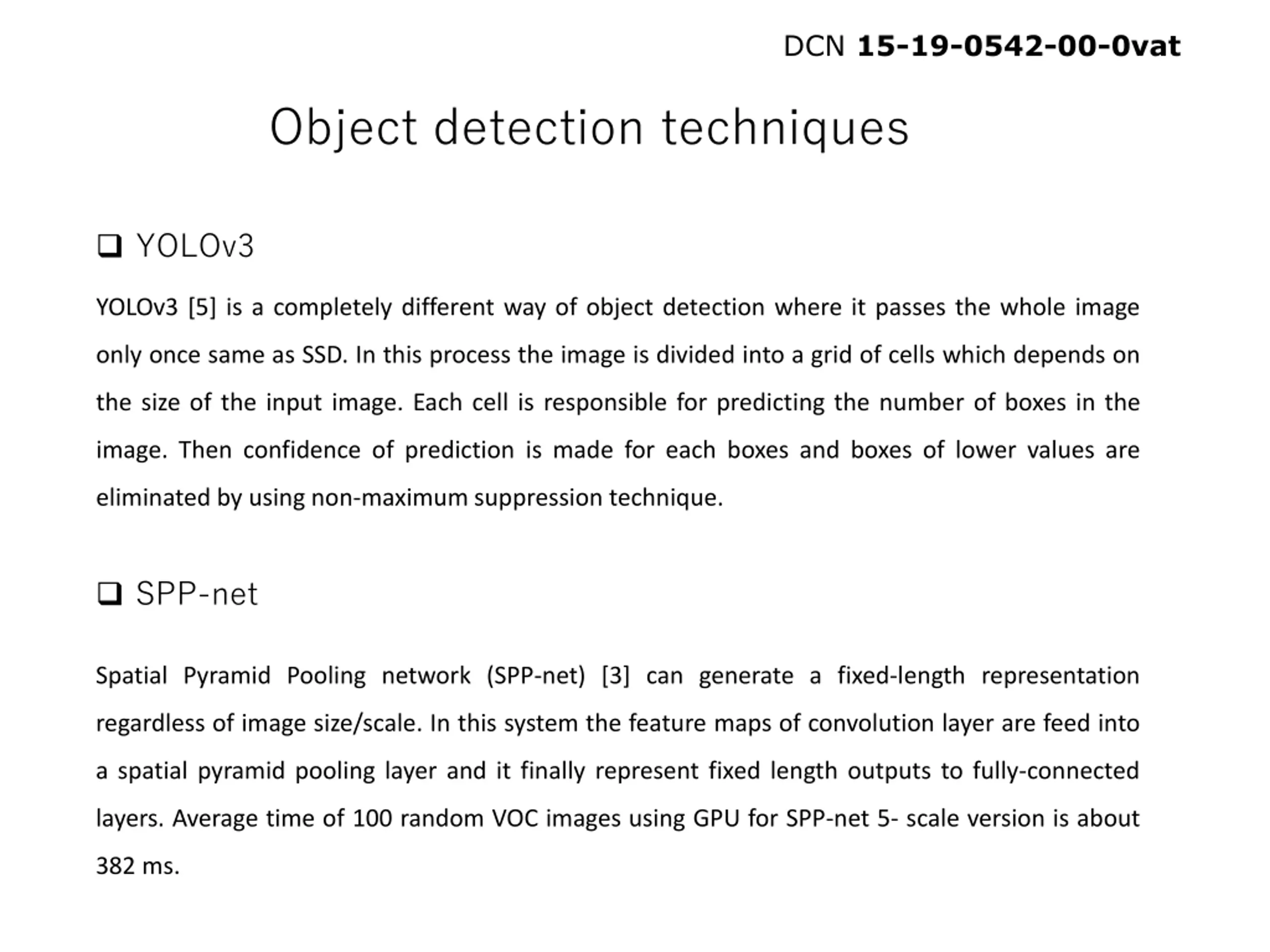 DCN 15-19-0542-00-0vat Object detection techniques YOLOv3 YOLOv3 [5] is a completely different way of object detection where it passes the whole image only once same as SSD. In this process the image is divided into a grid of cells which depends on the size of the input image. Each cell is responsible for predicting the number of boxes in the image. Then confidence of prediction is made for each boxes and boxes of lower values are eliminated by using non-maximum suppression technique. SPP-net Spatial Pyramid Pooling network (SPP-net) [3] can generate a fixed-length representation regardless of image size/scale. In this system the feature maps of convolution layer are feed into a spatial pyramid pooling layer and it finally represent fixed length outputs to fully-connected layers. Average time of 100 random VOC images using GPU for SPP-net 5- scale version is about 382 ms.