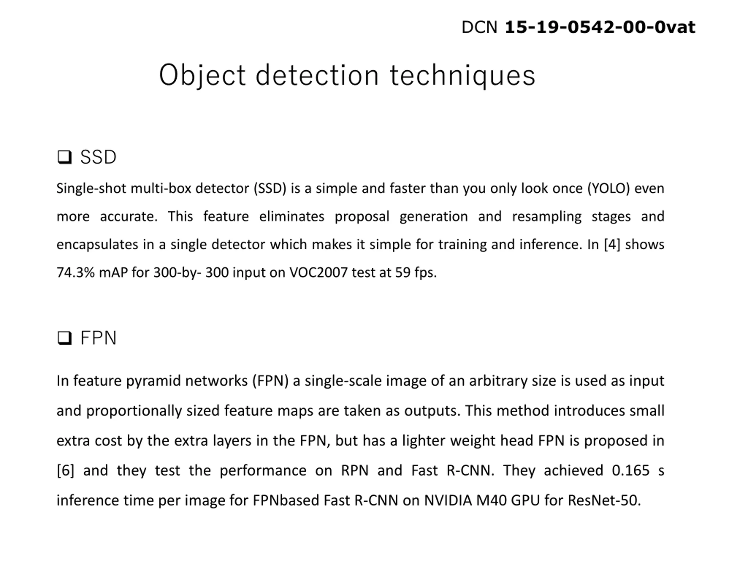 DCN 15-19-0542-00-0vat Object detection techniques SSD Single-shot multi-box detector (SSD) is a simple and faster than you only look once (YOLO) even more accurate. This feature eliminates proposal generation and resampling stages and encapsulates in a single detector which makes it simple for training and inference. In [4] shows 74.3% mAP for 300-by- 300 input on VOC2007 test at 59 fps. FPN In feature pyramid networks (FPN) a single-scale image of an arbitrary size is used as input and proportionally sized feature maps are taken as outputs. This method introduces small extra cost by the extra layers in the FPN, but has a lighter weight head FPN is proposed in [6] and they test the performance on RPN and Fast R-CNN. They achieved 0.165 s inference time per image for FPNbased Fast R-CNN on NVIDIA M40 GPU for ResNet-50.
