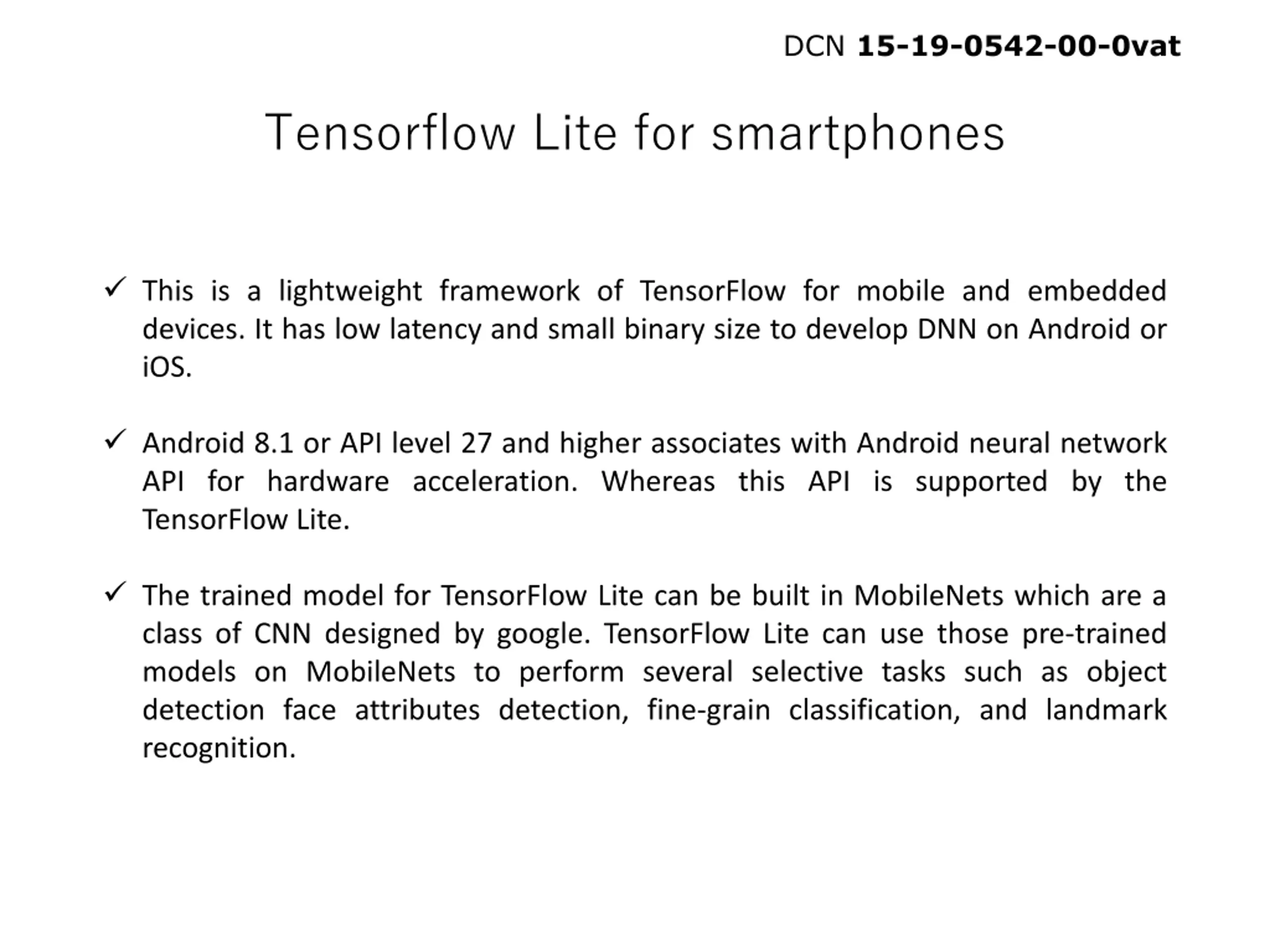 DCN 15-19-0542-00-0vat Tensorflow Lite for smartphones This is a lightweight framework of TensorFlow for mobile and embedded devices. It has low latency and small binary size to develop DNN on Android or iOS. Android 8.1 or API level 27 and higher associates with Android neural network API for hardware acceleration. Whereas this API is supported by the TensorFlow Lite. The trained model for TensorFlow Lite can be built in MobileNets which are a class of CNN designed by google. TensorFlow Lite can use those pre-trained models on MobileNets to perform several selective tasks such as object detection face attributes detection, fine-grain classification, and landmark recognition.