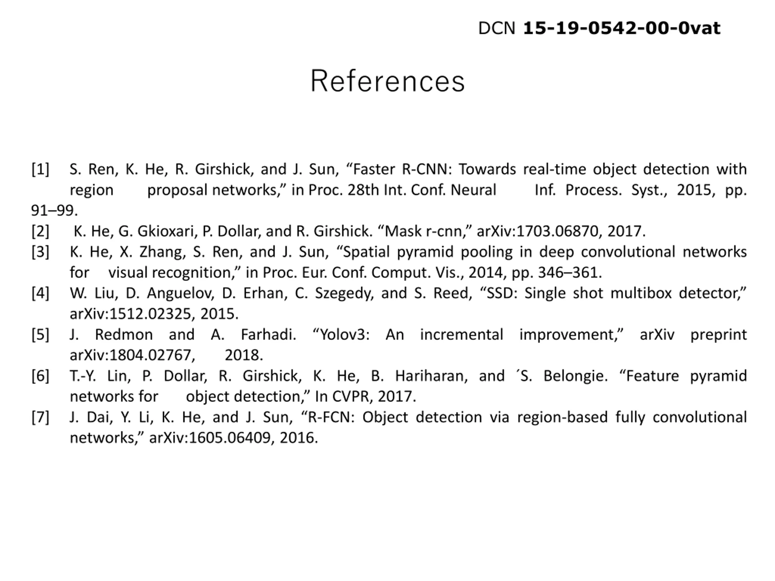 DCN 15-19-0542-00-0vat References [1] S. Ren, K. He, R. Girshick, and J. Sun, Faster R-CNN: Towards real-time object detection with region proposal networks, in Proc. 28th Int. Conf. Neural 91 99. [2] K. He, G. Gkioxari, P. Dollar, and R. Girshick. Mask r-cnn, arXiv:1703.06870, 2017. [3] K. He, X. Zhang, S. Ren, and J. Sun, Spatial pyramid pooling in deep convolutional networks for visual recognition, in Proc. Eur. Conf. Comput. Vis., 2014, pp. 346 361. [4] W. Liu, D. Anguelov, D. Erhan, C. Szegedy, and S. Reed, SSD: Single shot multibox detector, arXiv:1512.02325, 2015. [5] J. Redmon and A. Farhadi. Yolov3: An incremental improvement, arXiv preprint arXiv:1804.02767, 2018. [6] T.-Y. Lin, P. Dollar, R. Girshick, K. He, B. Hariharan, and S. Belongie. Feature pyramid networks for object detection, In CVPR, 2017. [7] J. Dai, Y. Li, K. He, and J. Sun, R-FCN: Object detection via region-based fully convolutional networks, arXiv:1605.06409, 2016. Inf. Process. Syst., 2015, pp.
