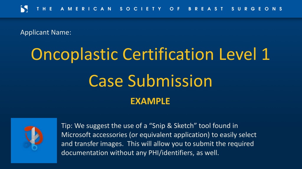 Learn how to submit oncoplastic certification Level 1 case documentation effectively with helpful tips and examples. Utilize tools like Snip & Sketch for image transfer without PHI/identifiers. Explore pre-operative and post-operative photos, operative reports, and pathology reports for a comprehensive overview of cases.