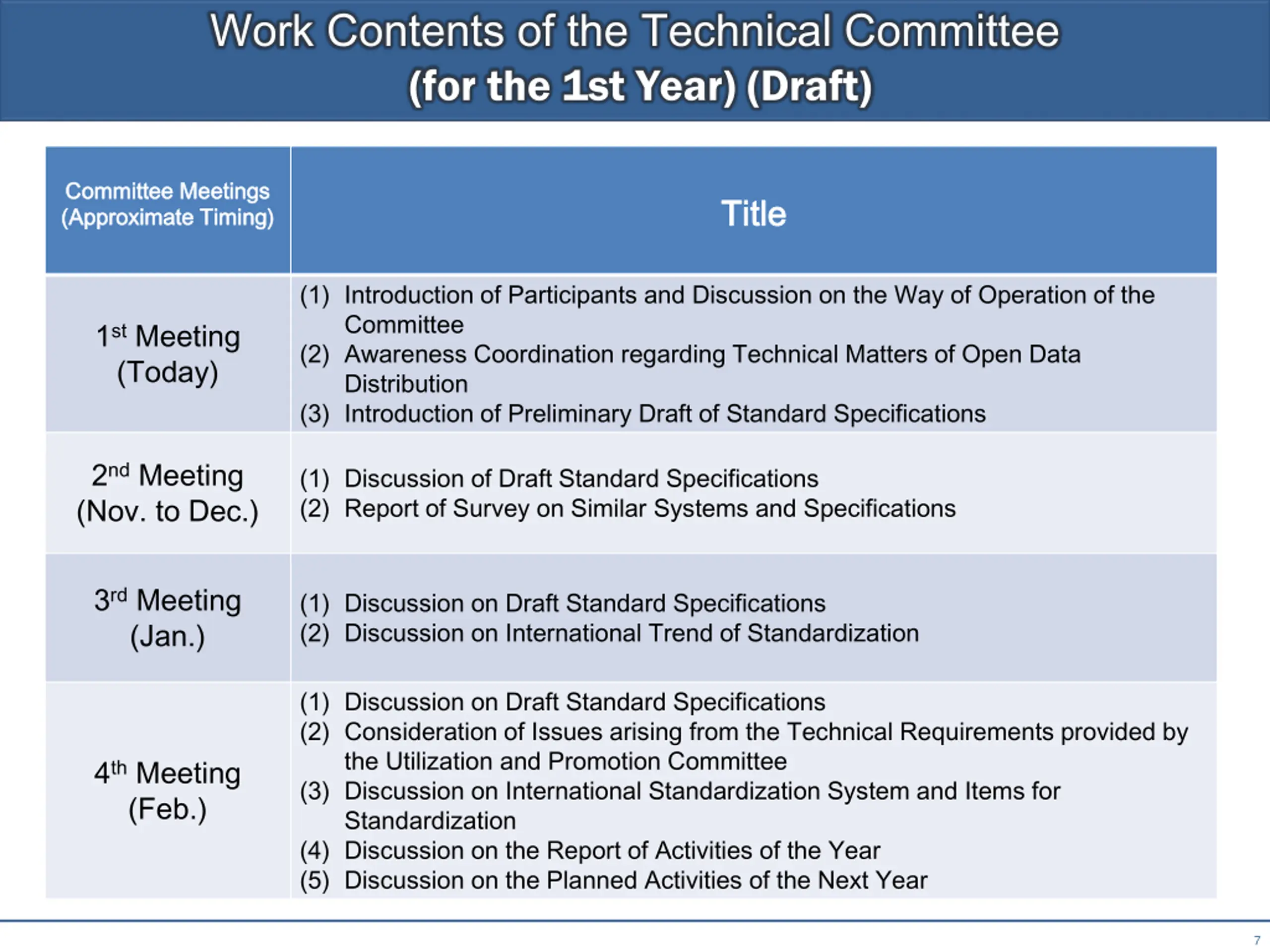 Work Contents of the Technical Committee (for 3 Years) (Draft) 1 1st stYear Year Consideration of Standard Specifications / Trend Survey of Standardization Activities (1) Consideration of Standard Specifications based on the draft (Sorting Out the Items for Standardization) (2) Trend Survey of Standardization (3) Consideration of System of Standardization Activities (Invitation of Collaborators) 2 2nd ndYear Year 3 3rd rdYear Year Basic Close Examination of Standard Specifications / Environment Creation for Standardization (1) Close Examination of Standard Specifications - Responses to the Technical Requirements provided by the Data Governance and Utilization & Dissemination Committees - Improvement of Specifications through the Practice on Concrete Open Data (2) Consideration of Subsidiary Technical Documents and Tools in connection with Standard Specifications (Usage Guide, Operation System, etc.) (3) Consideration of System of Standardization Activities including Foreign Countries (Invitation of Collaborators) Close Examination of Standard Specifications / Proposal of Standardization (1) In Continuation of the 2nd Year, Refinement of Standard Specifications (2) Close Examination of Subsidiary Technical Documents and Tools in connection with Standard Specifications (including Practical Operation in Accordance with Study Items) (3) Report of Standardization Activities and Discussion Principle of the Work Major Study Items Technical Requirements from Data Governance and Utilization and Promotion Committees Acquisition of Concrete Open Data in Accordance with Study Items 6