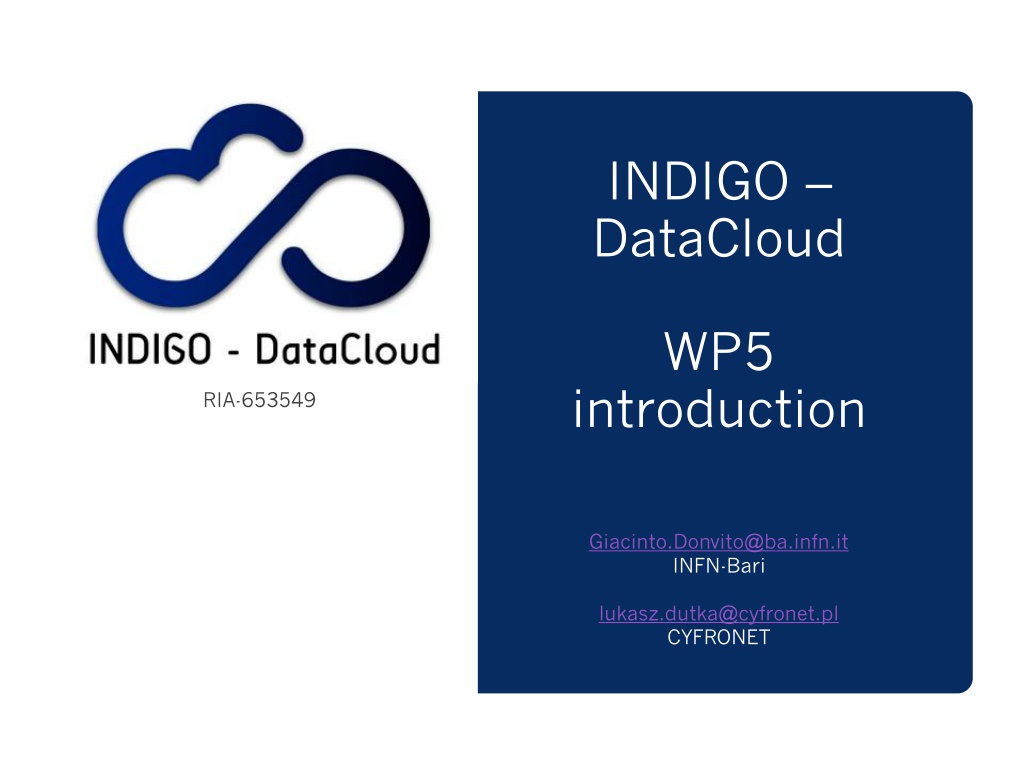 INDIGO DataCloud WP5 introduction RIA-653549 Giacinto.Donvito@ba.infn.it INFN-Bari lukasz.dutka@cyfronet.pl CYFRONET