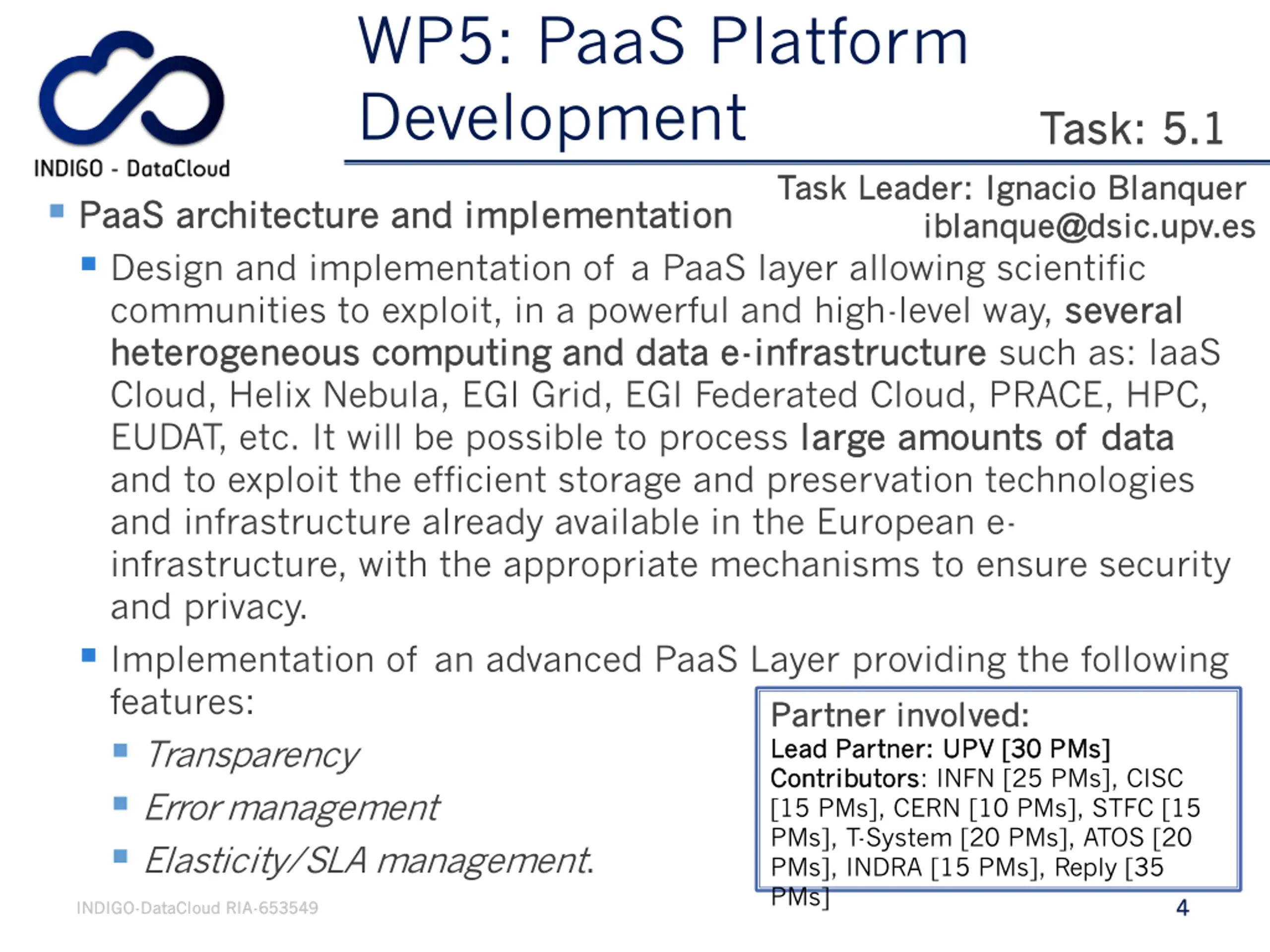 WP5: PaaS Platform Development Task: 5.1 Task: 5.1 Blanquer Task Leader: Ignacio Task Leader: Ignacio Blanquer iblanque@dsic.upv.es iblanque@dsic.upv.es PaaS PaaS architecture and implementation architecture and implementation Design and implementation of a PaaS layer allowing scientific communities to exploit, in a powerful and high-level way, several heterogeneous computing and data e heterogeneous computing and data e- -infrastructure Cloud, Helix Nebula, EGI Grid, EGI Federated Cloud, PRACE, HPC, EUDAT, etc. It will be possible to process large amounts of data and to exploit the efficient storage and preservation technologies and infrastructure already available in the European e- infrastructure, with the appropriate mechanisms to ensure security and privacy. Implementation of an advanced PaaS Layer providing the following features: Transparency Error management Elasticity/SLA management. several infrastructure such as: IaaS large amounts of data Partner involved: Partner involved: Lead Partner: UPV [30 PMs] Lead Partner: UPV [30 PMs] Contributors Contributors: INFN [25 PMs], CISC [15 PMs], CERN [10 PMs], STFC [15 PMs], T-System [20 PMs], ATOS [20 PMs], INDRA [15 PMs], Reply [35 PMs] 4 4 INDIGO INDIGO- -DataCloud DataCloud RIA RIA- -653549 653549