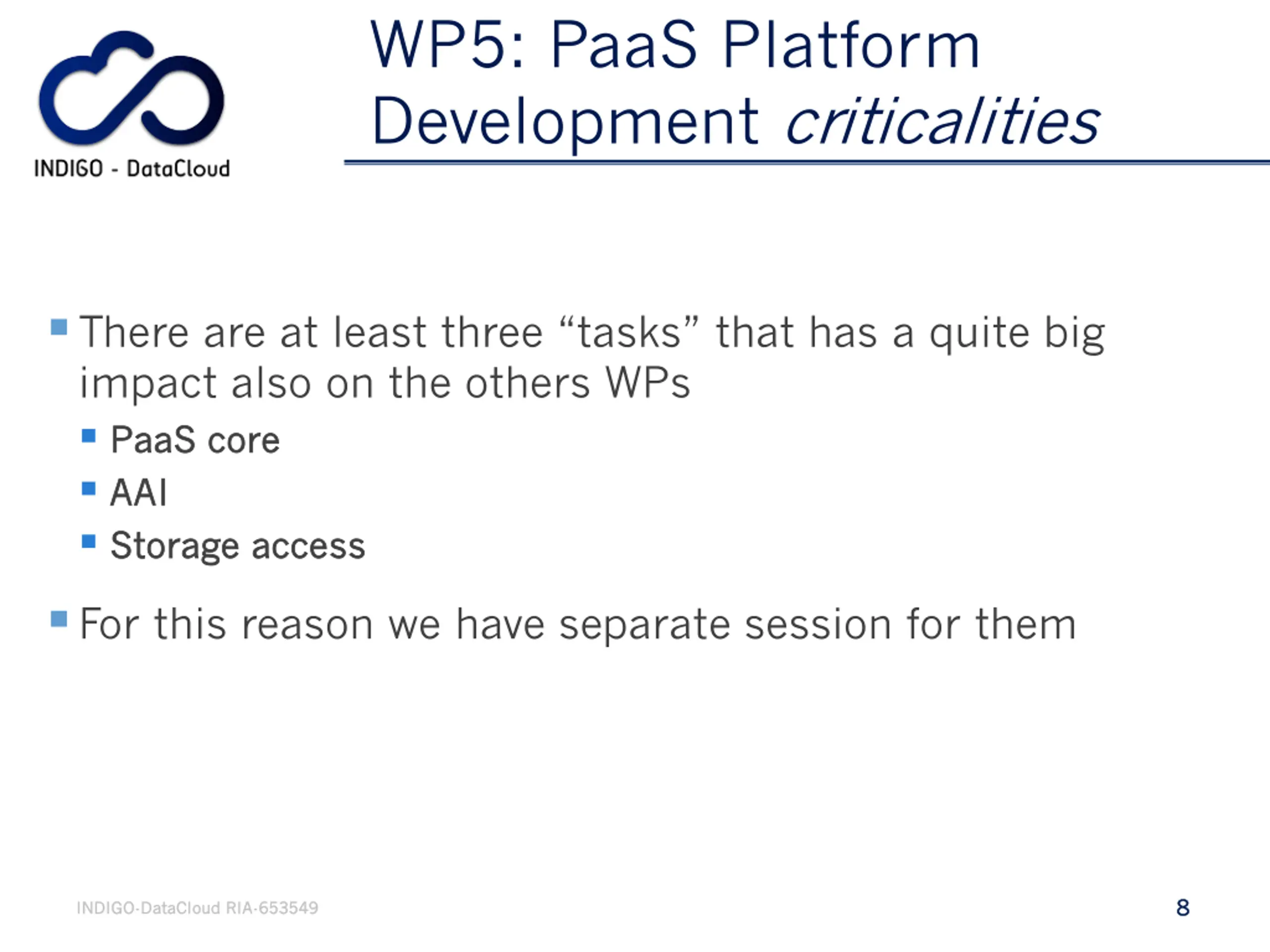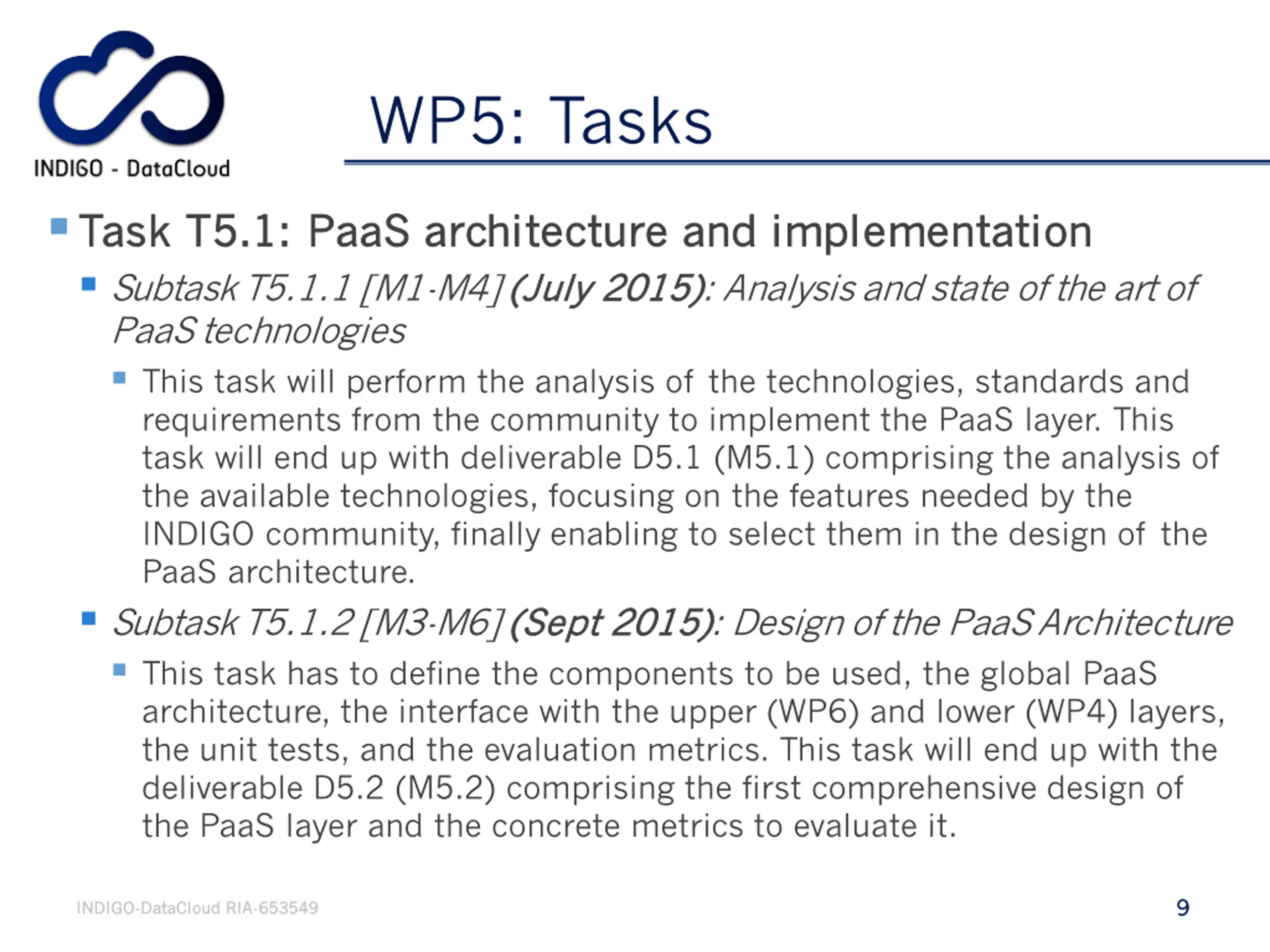 WP5: PaaS Platform Development criticalities There are at least three tasks that has a quite big impact also on the others WPs PaaS PaaS core core AAI AAI Storage access Storage access For this reason we have separate session for them 8 8 INDIGO INDIGO- -DataCloud DataCloud RIA RIA- -653549 653549