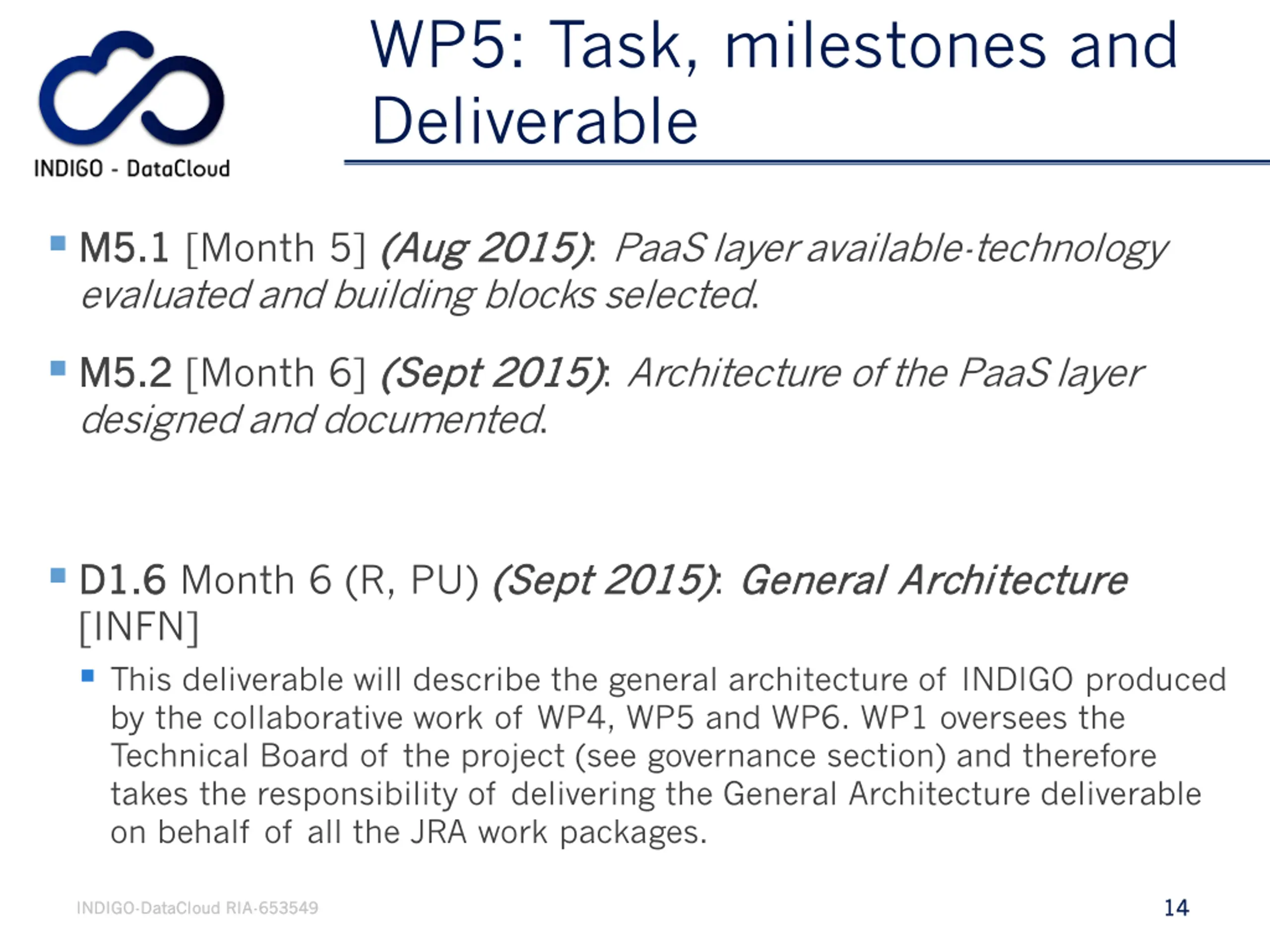 WP5: Milestones and Deliverable D5.1, Month 5 D5.1, Month 5 (R, PU) (Aug 2015) technologies at the base of PaaSarchitecture [UPV] Provide an overview of the state of the art technologies used as base for the PaaS architecture. The technologies will be evaluated on the bases of the requirements coming from user-communities and on the requirement analysis from WP2 and WP6. D5.2, Month 6 D5.2, Month 6 (R, PU) (Sept 2015 (Sept 2015) ): Design Document and work plan for the PaaSarchitecture [Cyfronet|INFN] This deliverable contains the detailed design document and the resulting work plan of the technical area, compliant with the overall Technical Development Plan including WP4 and WP6. (Aug 2015): State of the art for the 13 13 INDIGO INDIGO- -DataCloud DataCloud RIA RIA- -653549 653549