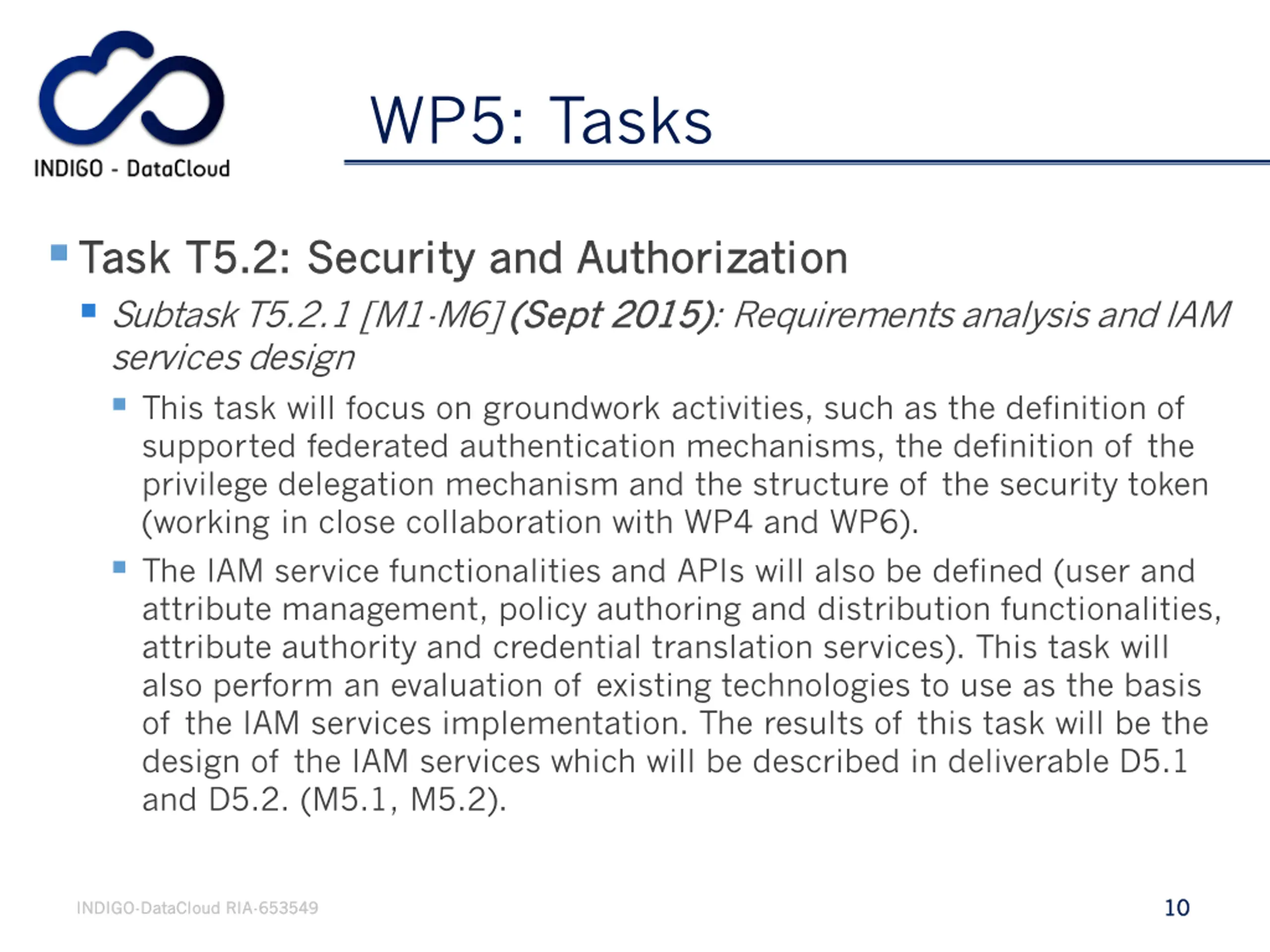 WP5: Tasks Task T5.2: Security and Authorization Task T5.2: Security and Authorization Subtask T5.2.1 [M1-M6] (Sept 2015) services design This task will focus on groundwork activities, such as the definition of supported federated authentication mechanisms, the definition of the privilege delegation mechanism and the structure of the security token (working in close collaboration with WP4 and WP6). The IAM service functionalities and APIs will also be defined (user and attribute management, policy authoring and distribution functionalities, attribute authority and credential translation services). This task will also perform an evaluation of existing technologies to use as the basis of the IAM services implementation. The results of this task will be the design of the IAM services which will be described in deliverable D5.1 and D5.2. (M5.1, M5.2). (Sept 2015): Requirements analysis and IAM 10 10 INDIGO INDIGO- -DataCloud DataCloud RIA RIA- -653549 653549