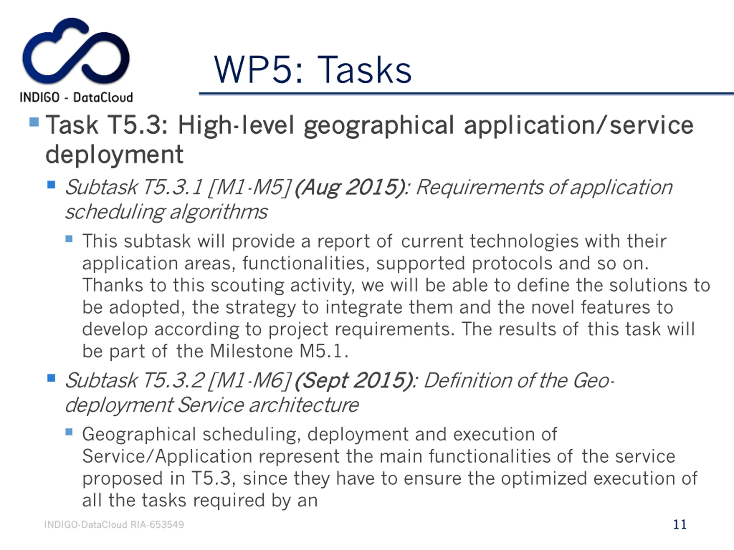 WP5: Tasks Task T5.3: Task T5.3: High deployment deployment Subtask T5.3.1 [M1-M5] (Aug 2015) scheduling algorithms This subtask will provide a report of current technologies with their application areas, functionalities, supported protocols and so on. Thanks to this scouting activity, we will be able to define the solutions to be adopted, the strategy to integrate them and the novel features to develop according to project requirements. The results of this task will be part of the Milestone M5.1. Subtask T5.3.2 [M1-M6] (Sept 2015) (Sept 2015): Definition of the Geo- deployment Service architecture Geographical scheduling, deployment and execution of Service/Application represent the main functionalities of the service proposed in T5.3, since they have to ensure the optimized execution of all the tasks required by an High- -level geographical application/service level geographical application/service (Aug 2015): Requirements of application 11 11 INDIGO INDIGO- -DataCloud DataCloud RIA RIA- -653549 653549