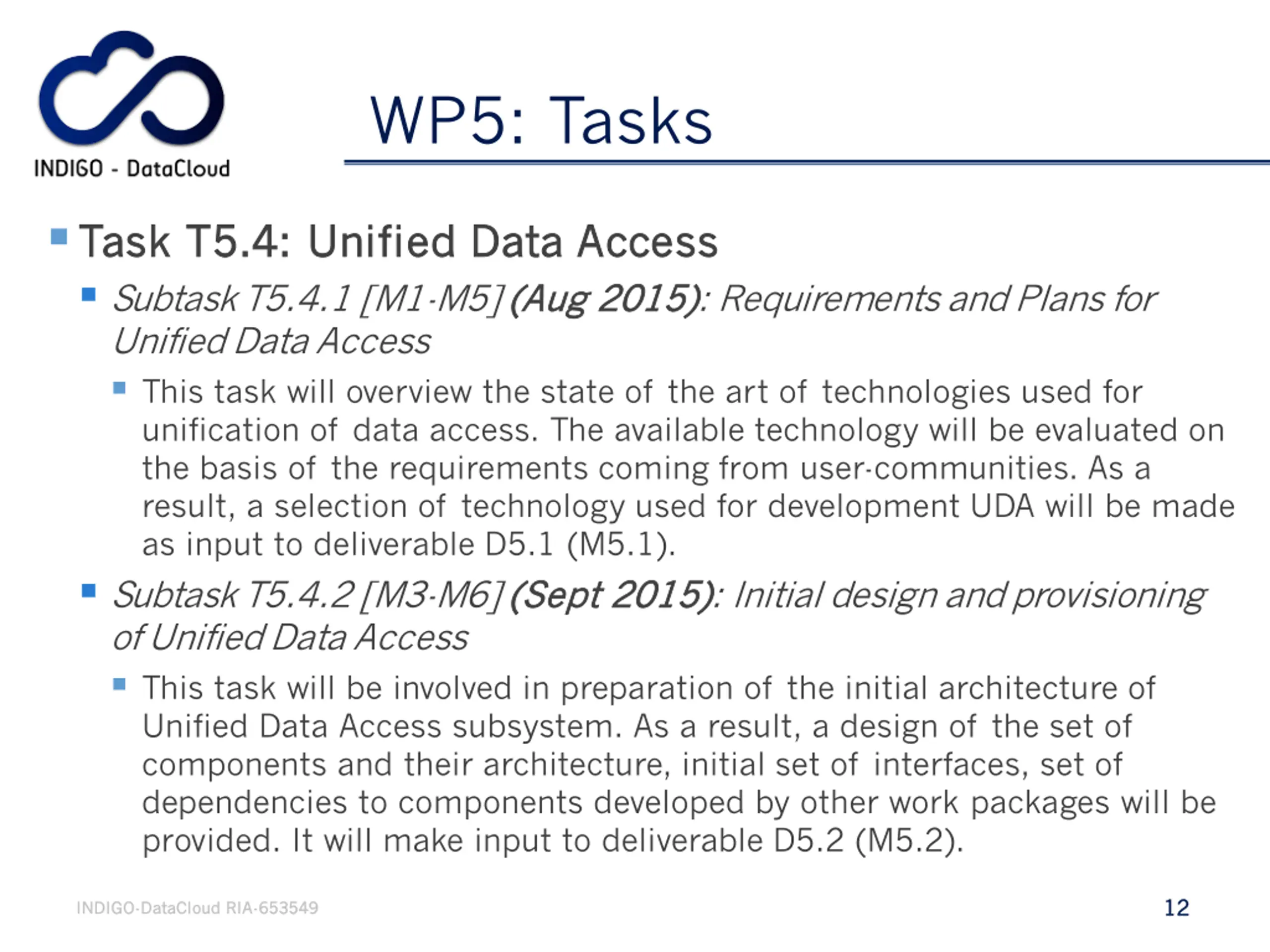 WP5: Tasks Task T5.4: Task T5.4: Unified Subtask T5.4.1 [M1-M5] (Aug Unified Data Access This task will overview the state of the art of technologies used for unification of data access. The available technology will be evaluated on the basis of the requirements coming from user-communities. As a result, a selection of technology used for development UDA will be made as input to deliverable D5.1 (M5.1). Subtask T5.4.2 [M3-M6] (Sept (Sept 2015) 2015): Initial design and provisioning of Unified Data Access This task will be involved in preparation of the initial architecture of Unified Data Access subsystem. As a result, a design of the set of components and their architecture, initial set of interfaces, set of dependencies to components developed by other work packages will be provided. It will make input to deliverable D5.2 (M5.2). Unified Data Data Access Access (Aug 2015) 2015): Requirements and Plans for 12 12 INDIGO INDIGO- -DataCloud DataCloud RIA RIA- -653549 653549