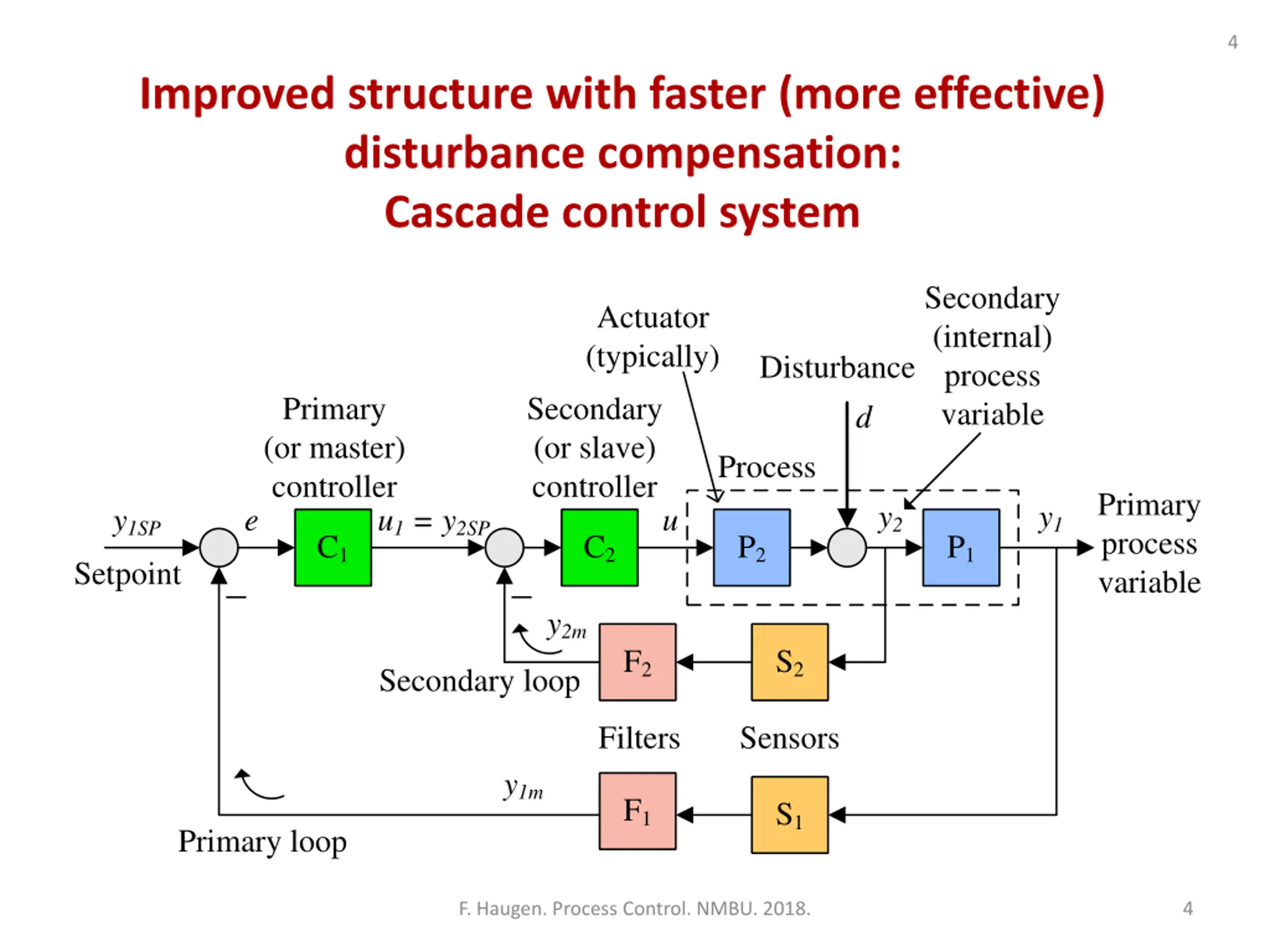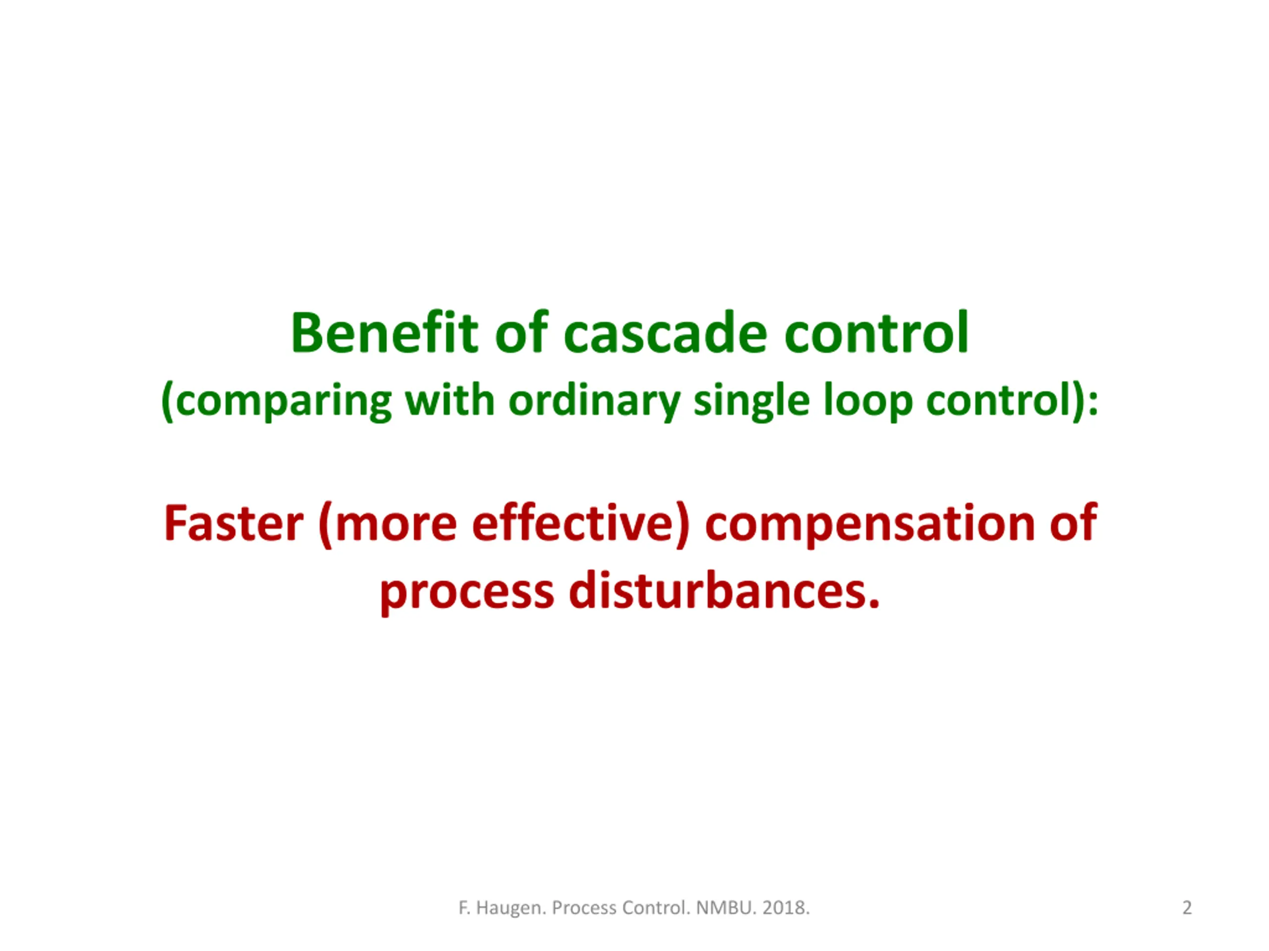 Benefit of cascade control (comparing with ordinary single loop control): Faster (more effective) compensation of process disturbances. F. Haugen. Process Control. NMBU. 2018. 2