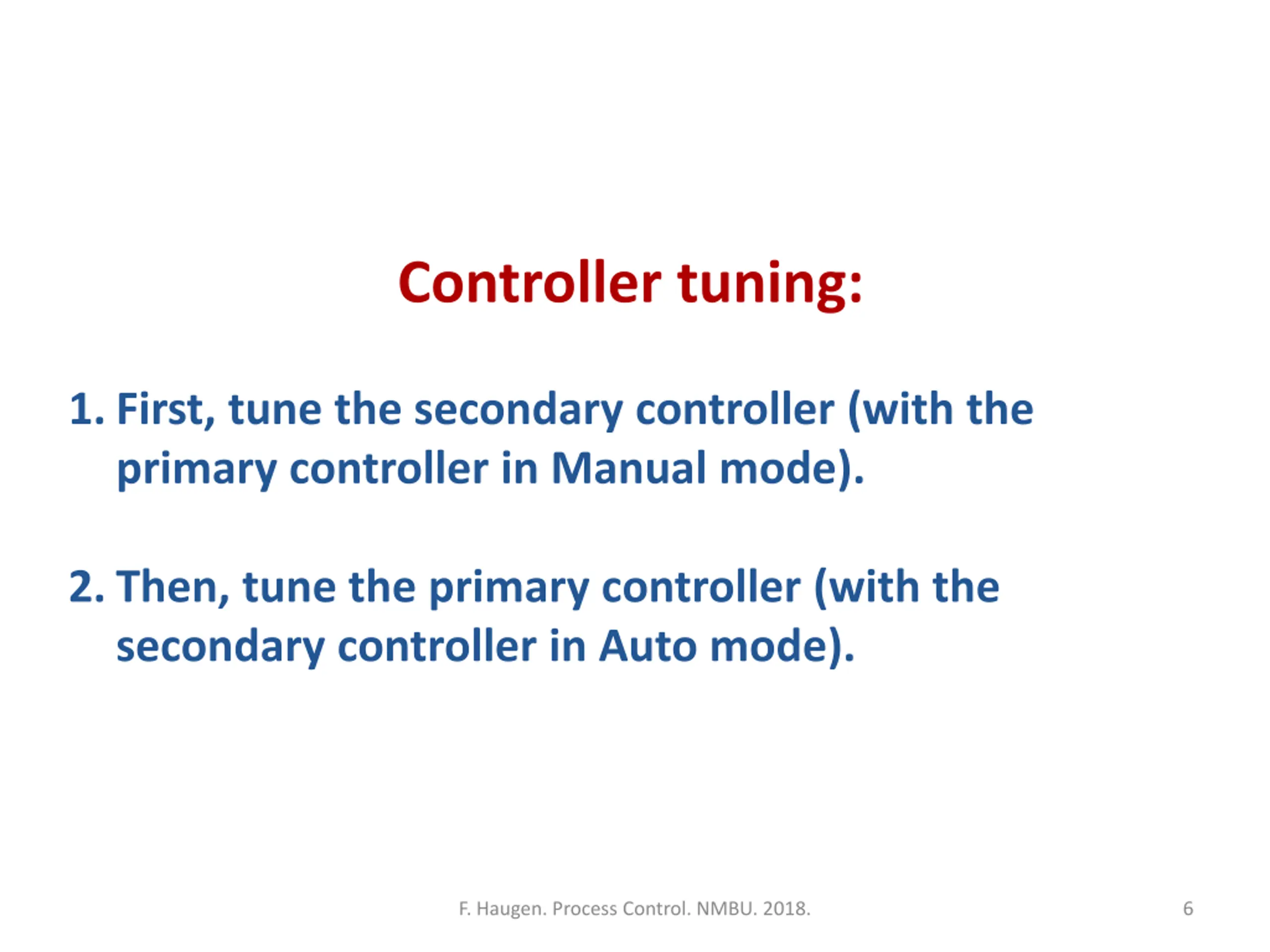 Controller tuning: 1.First, tune the secondary controller (with the primary controller in Manual mode). 2.Then, tune the primary controller (with the secondary controller in Auto mode). F. Haugen. Process Control. NMBU. 2018. 6