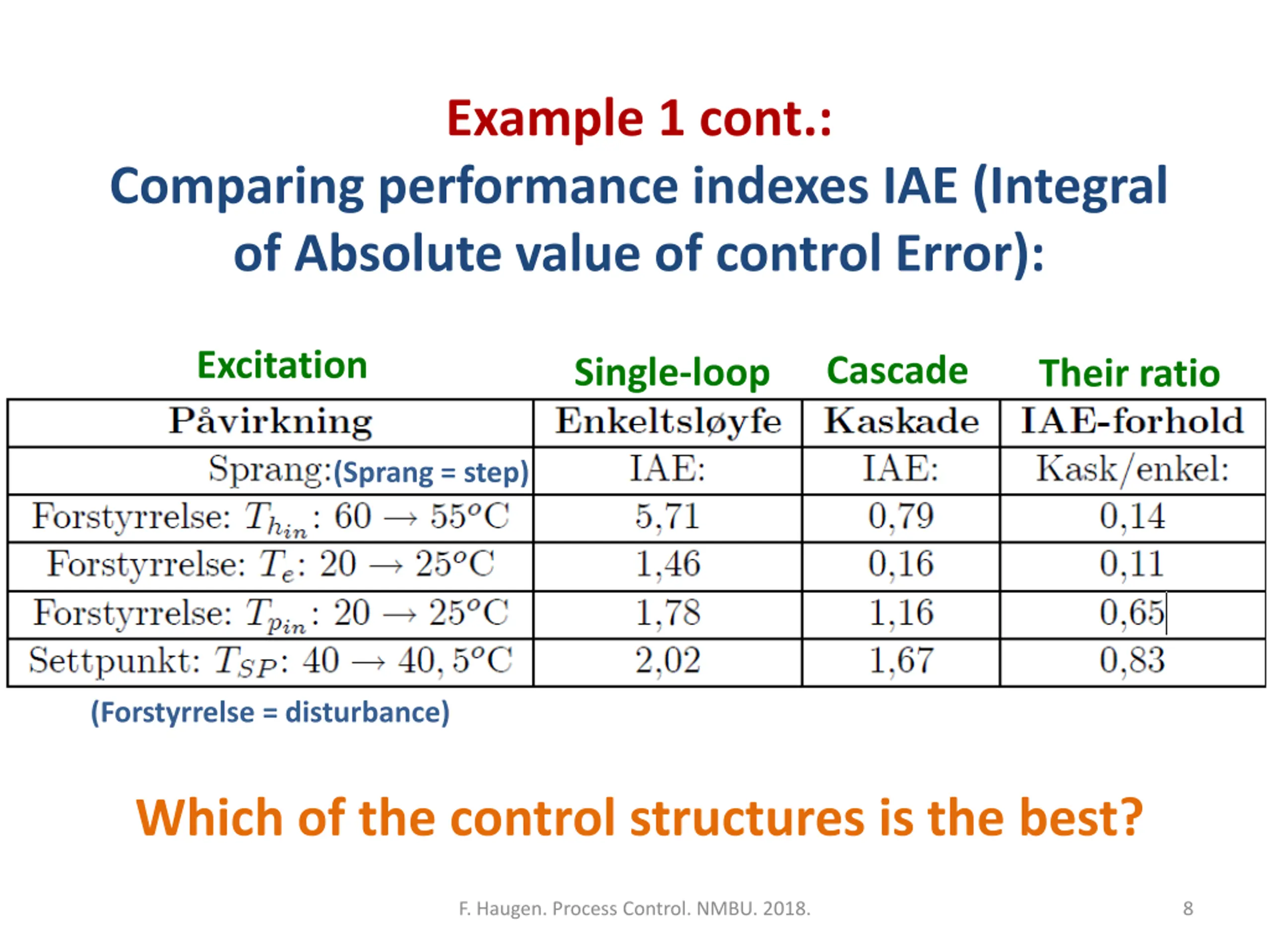 Example 1 cont.: Comparing performance indexes IAE (Integral of Absolute value of control Error): Excitation Cascade Single-loop Their ratio (Sprang = step) (Forstyrrelse = disturbance) Which of the control structures is the best? F. Haugen. Process Control. NMBU. 2018. 8