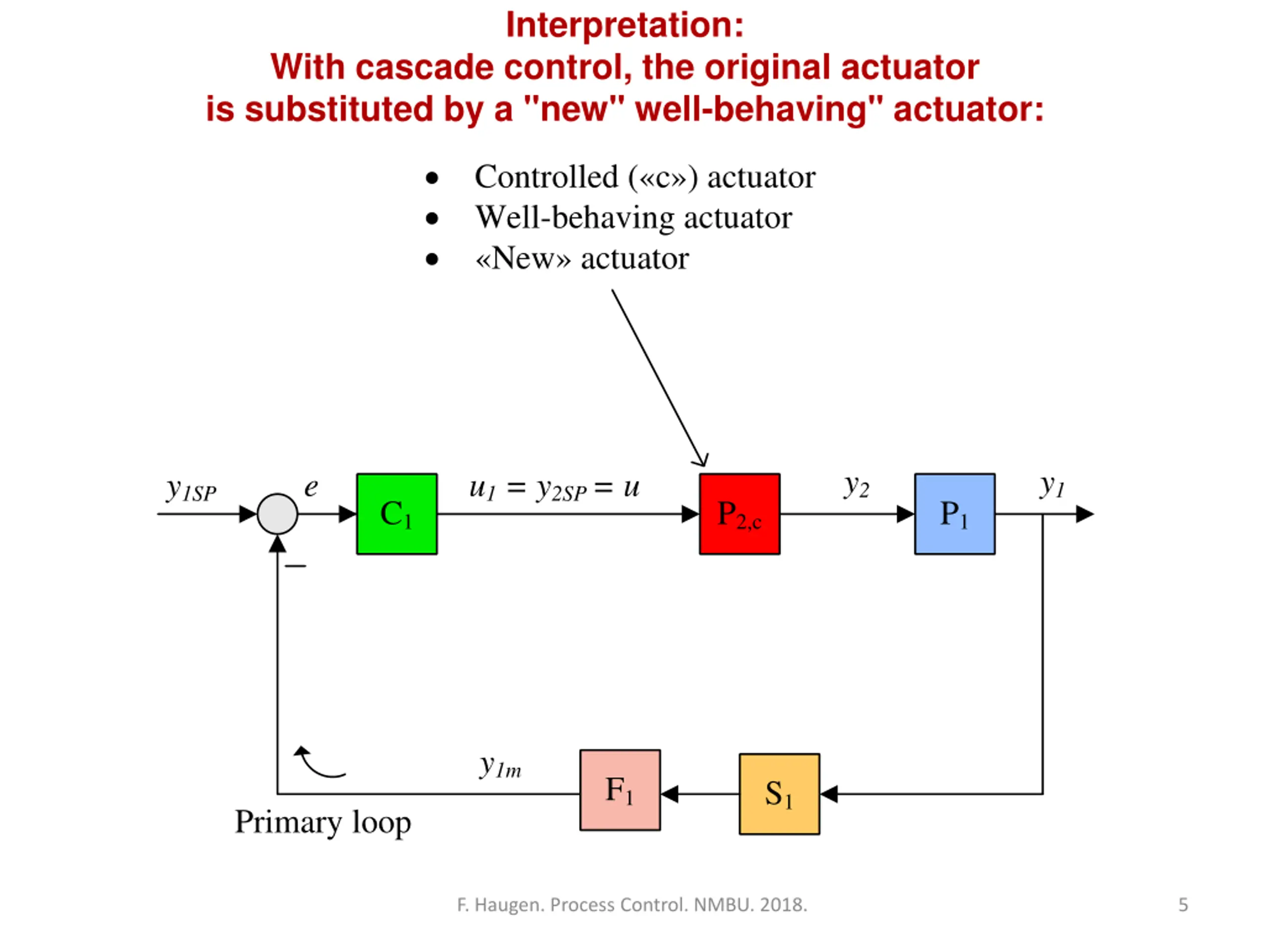 Interpretation: With cascade control, the original actuator is substituted by a "new" well-behaving" actuator: Controlled ( c ) actuator Well-behaving actuator New actuator y2 y1 y1SP e u1 = y2SP = u C1 P2,c P1 y1m F1 S1 Primary loop F. Haugen. Process Control. NMBU. 2018. 5