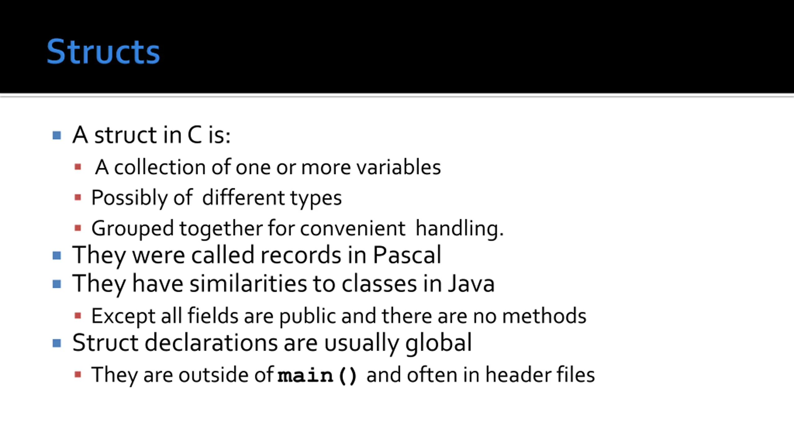 A struct in C is: A collection of one or more variables Possibly of different types Grouped together for convenient handling. They were called records in Pascal They have similarities to classes in Java Except all fields are public and there are no methods Struct declarations are usually global They are outside of main() and often in header files