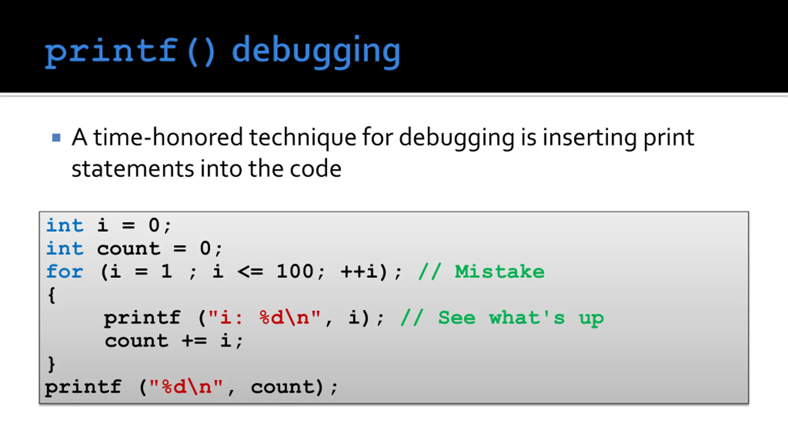 A time-honored technique for debugging is inserting print statements into the code int i = 0; int count = 0; for (i = 1 ; i <= 100; ++i); // Mistake { printf ("i: %d\n", i); // See what's up count += i; } printf ("%d\n", count);