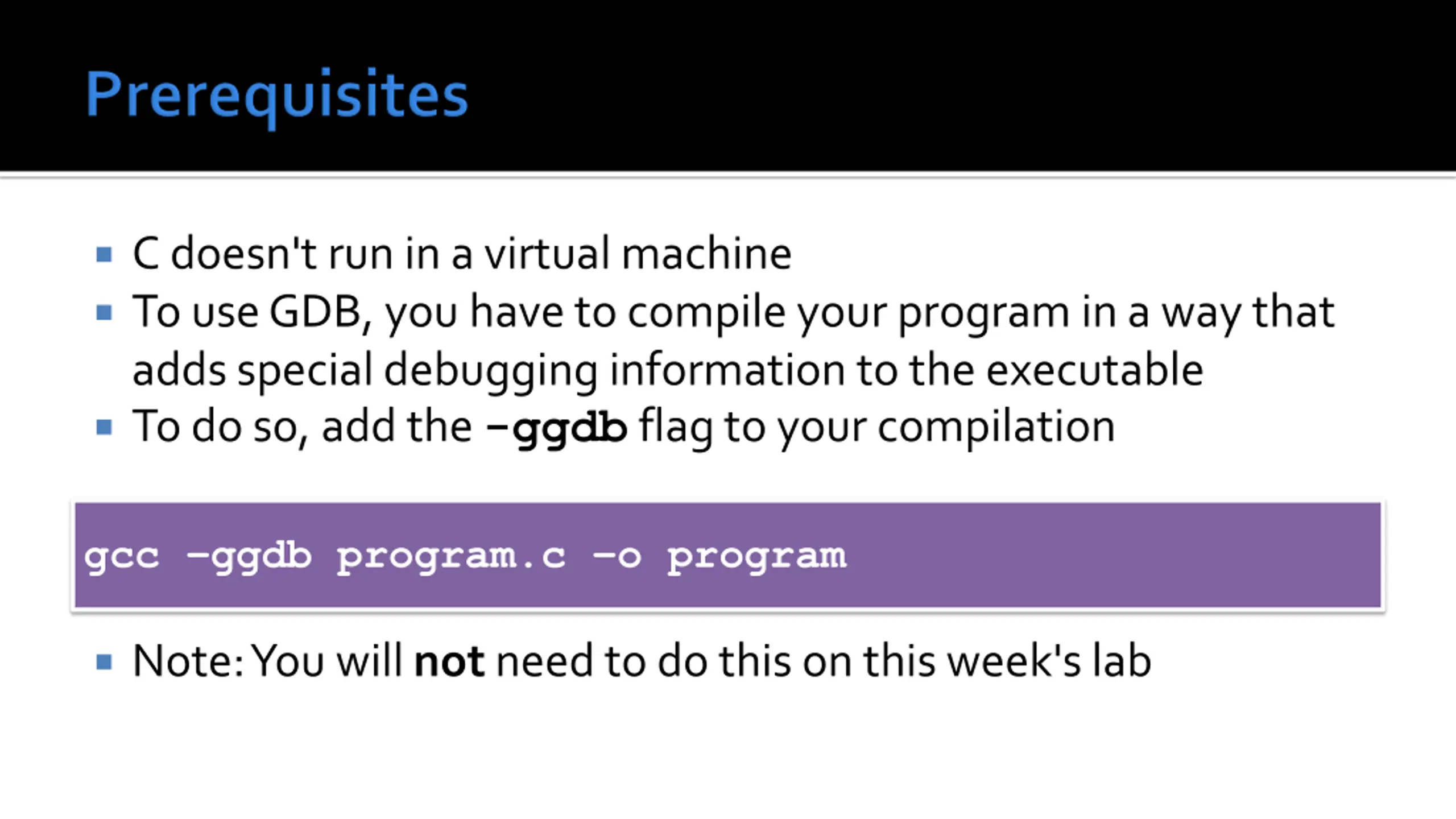 C doesn't run in a virtual machine To use GDB, you have to compile your program in a way that adds special debugging information to the executable To do so, add the -ggdb flag to your compilation gcc ggdb program.c o program Note: You will not need to do this on this week's lab