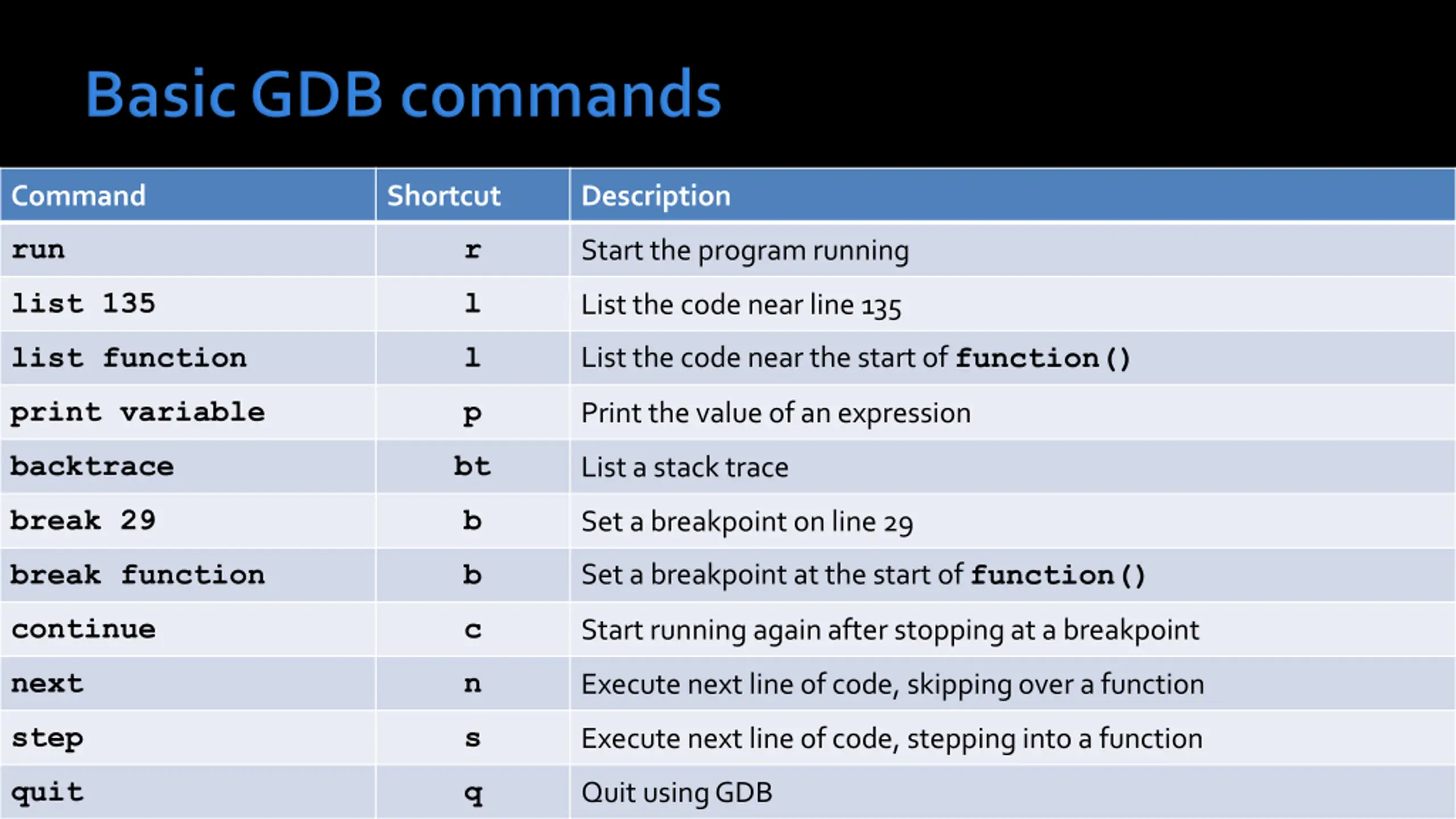 Command Shortcut Description run r Start the program running list 135 l List the code near line 135 list function l List the code near the start of function() print variable p Print the value of an expression backtrace bt List a stack trace break 29 b Set a breakpoint on line 29 break function b Set a breakpoint at the start of function() continue c Start running again after stopping at a breakpoint next n Execute next line of code, skipping over a function step s Execute next line of code, stepping into a function quit q Quit using GDB