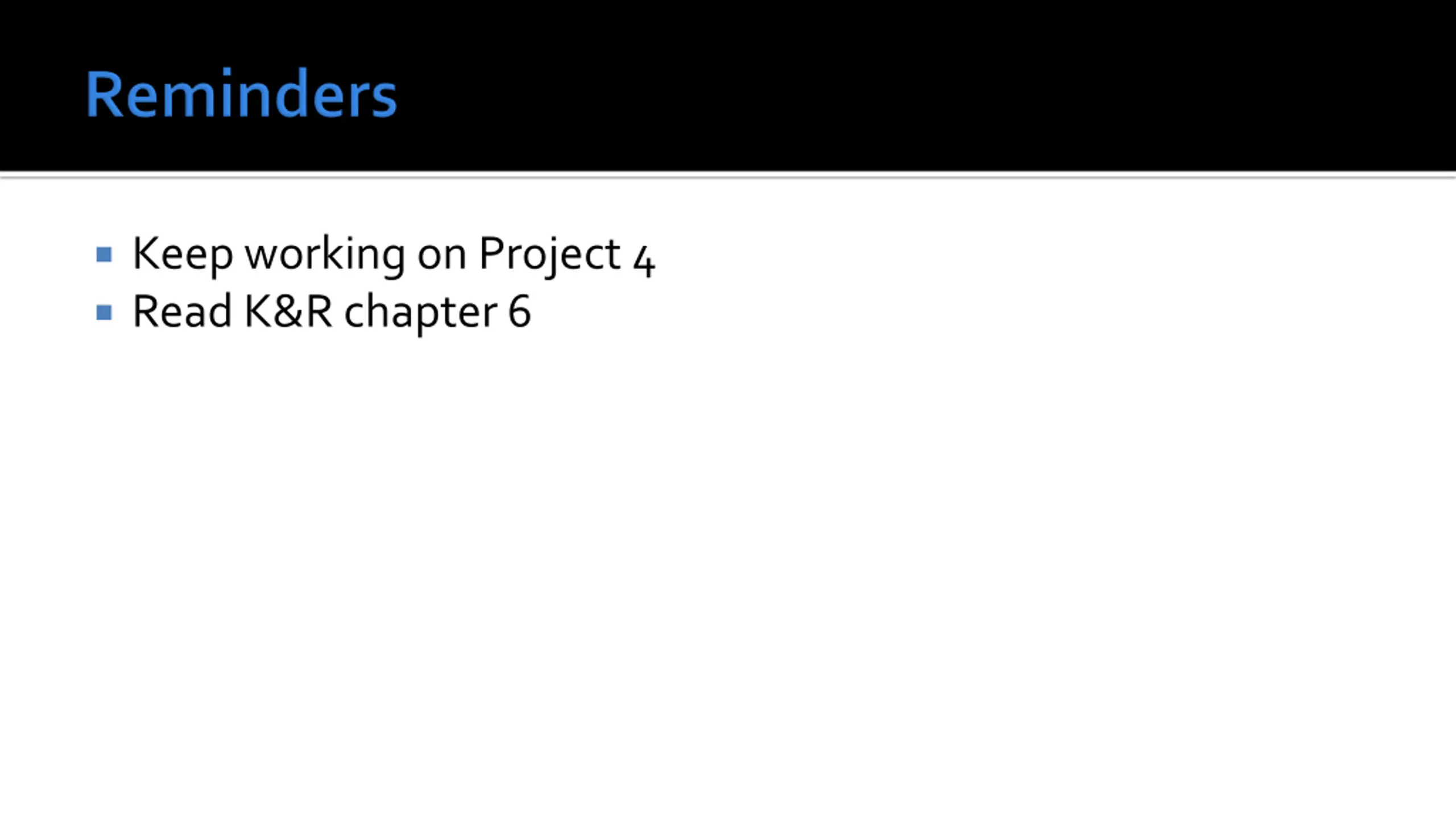 Keep working on Project 4 Read K&R chapter 6