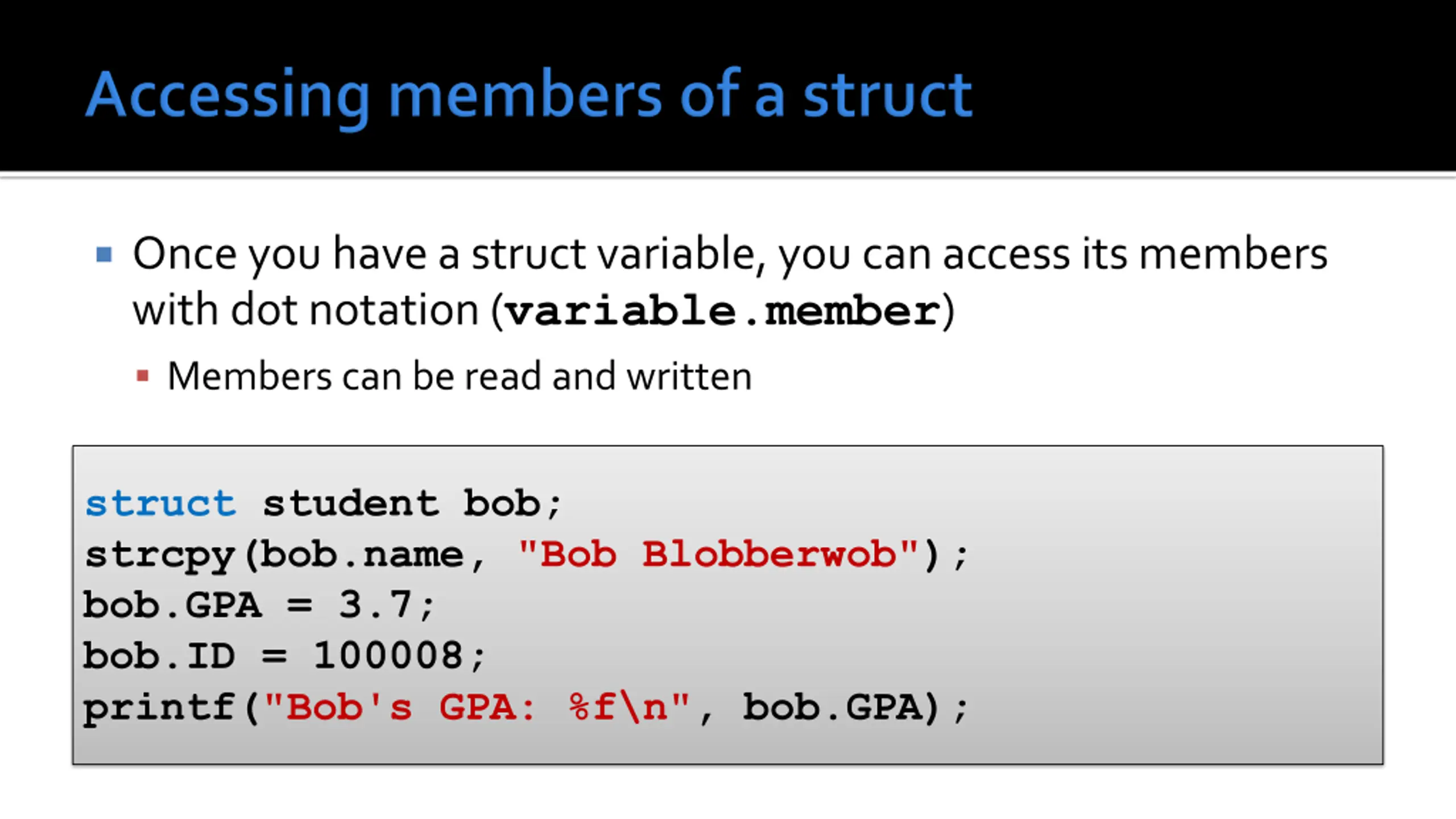 Once you have a struct variable, you can access its members with dot notation (variable.member) Members can be read and written struct student bob; strcpy(bob.name, "Bob Blobberwob"); bob.GPA = 3.7; bob.ID = 100008; printf("Bob's GPA: %f\n", bob.GPA);