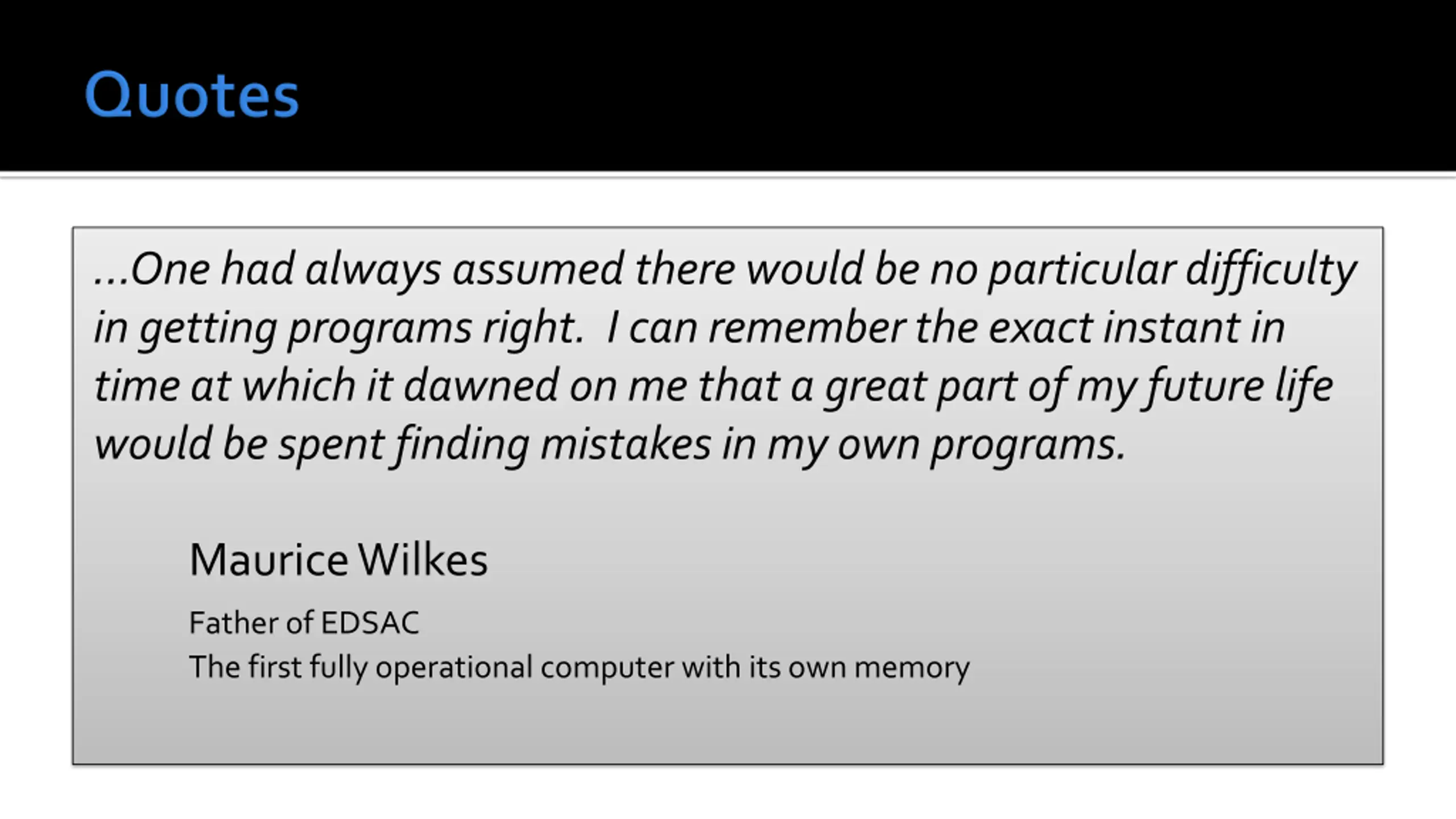 ...One had always assumed there would be no particular difficulty in getting programs right. I can remember the exact instant in time at which it dawned on me that a great part of my future life would be spent finding mistakes in my own programs. Maurice Wilkes Father of EDSAC The first fully operational computer with its own memory