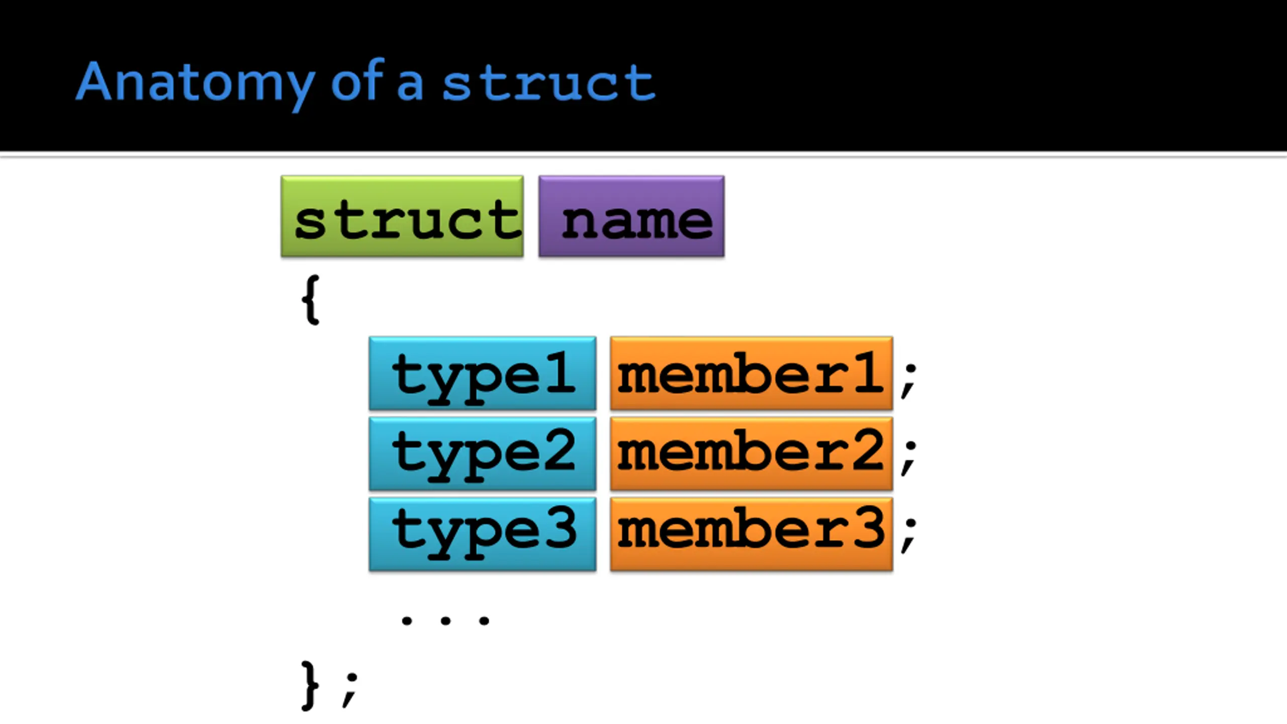 struct name { type1 member1; type2 member2; type3 member3; ... };