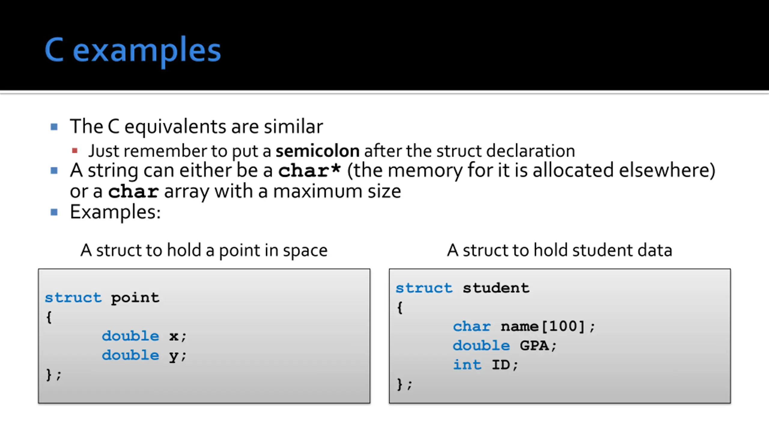 The C equivalents are similar Just remember to put a semicolon after the struct declaration A string can either be a char* (the memory for it is allocated elsewhere) or a char array with a maximum size Examples: A struct to hold a point in space A struct to hold student data struct student { char name[100]; double GPA; int ID; }; struct point { double x; double y; };