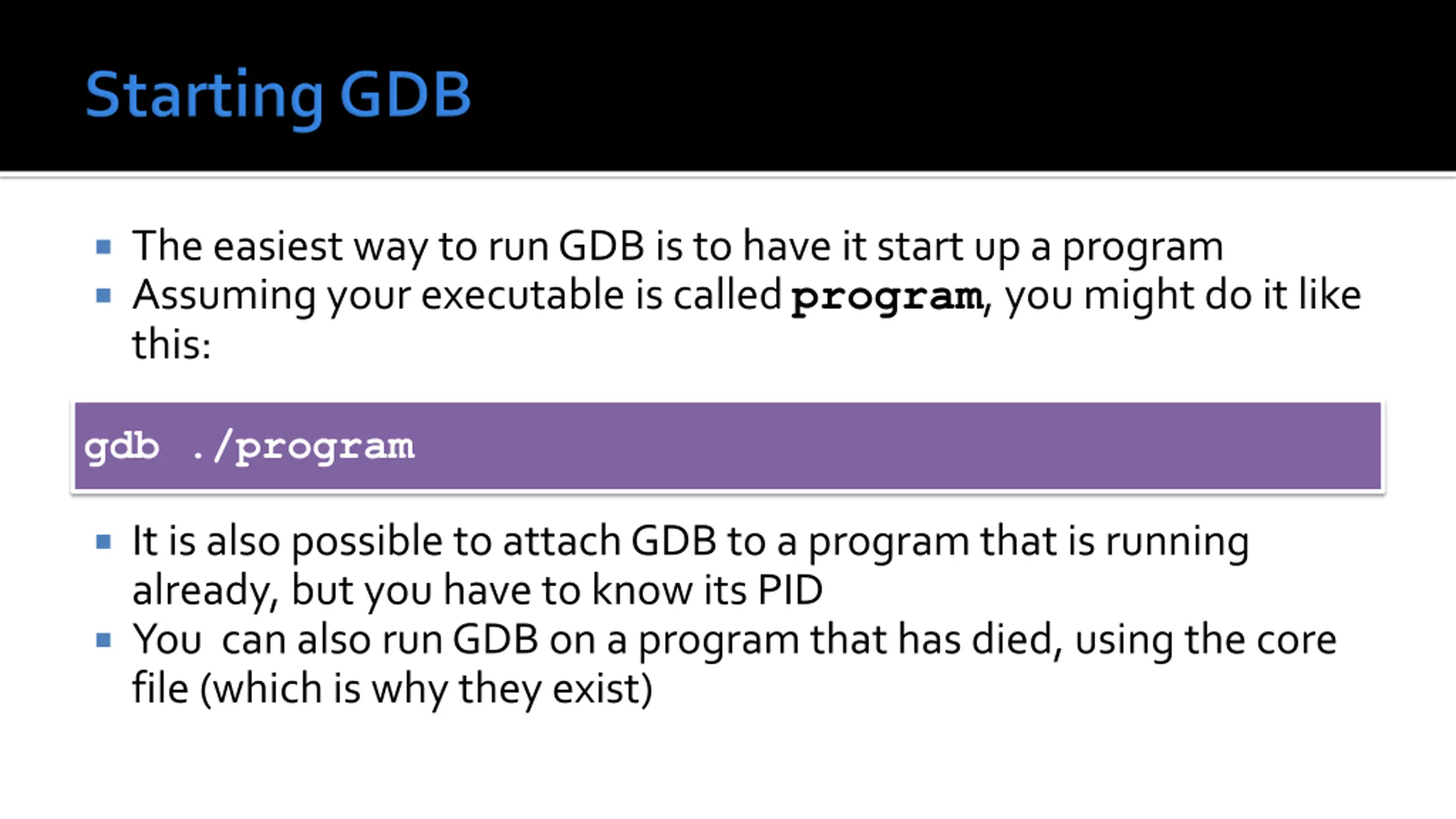 The easiest way to run GDB is to have it start up a program Assuming your executable is called program, you might do it like this: gdb ./program It is also possible to attach GDB to a program that is running already, but you have to know its PID You can also run GDB on a program that has died, using the core file (which is why they exist)