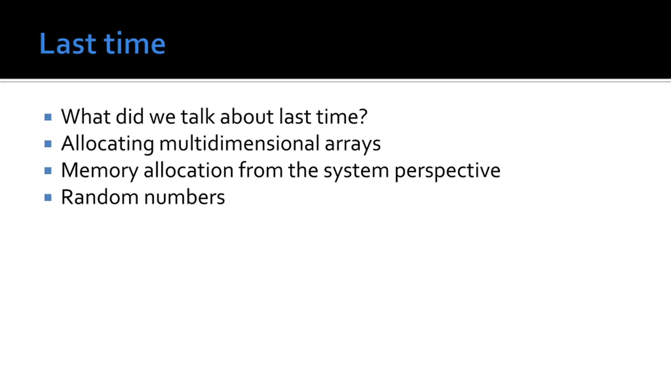 What did we talk about last time? Allocating multidimensional arrays Memory allocation from the system perspective Random numbers
