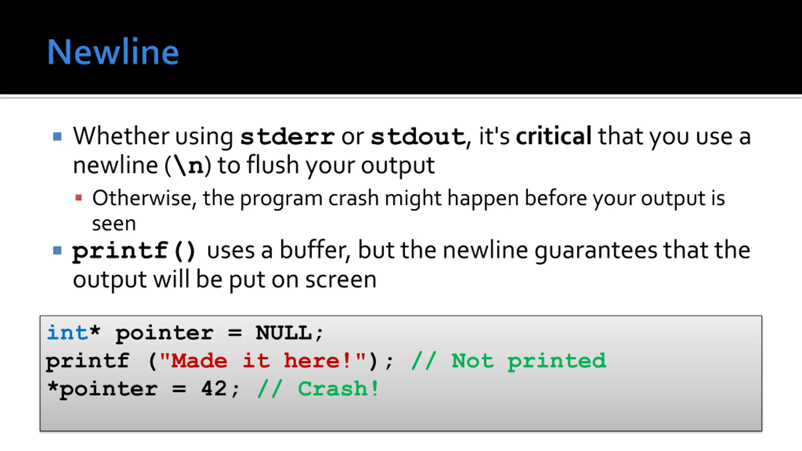 Whether using stderr or stdout, it's critical that you use a newline (\n) to flush your output Otherwise, the program crash might happen before your output is seen printf() uses a buffer, but the newline guarantees that the output will be put on screen int* pointer = NULL; printf ("Made it here!"); // Not printed *pointer = 42; // Crash!