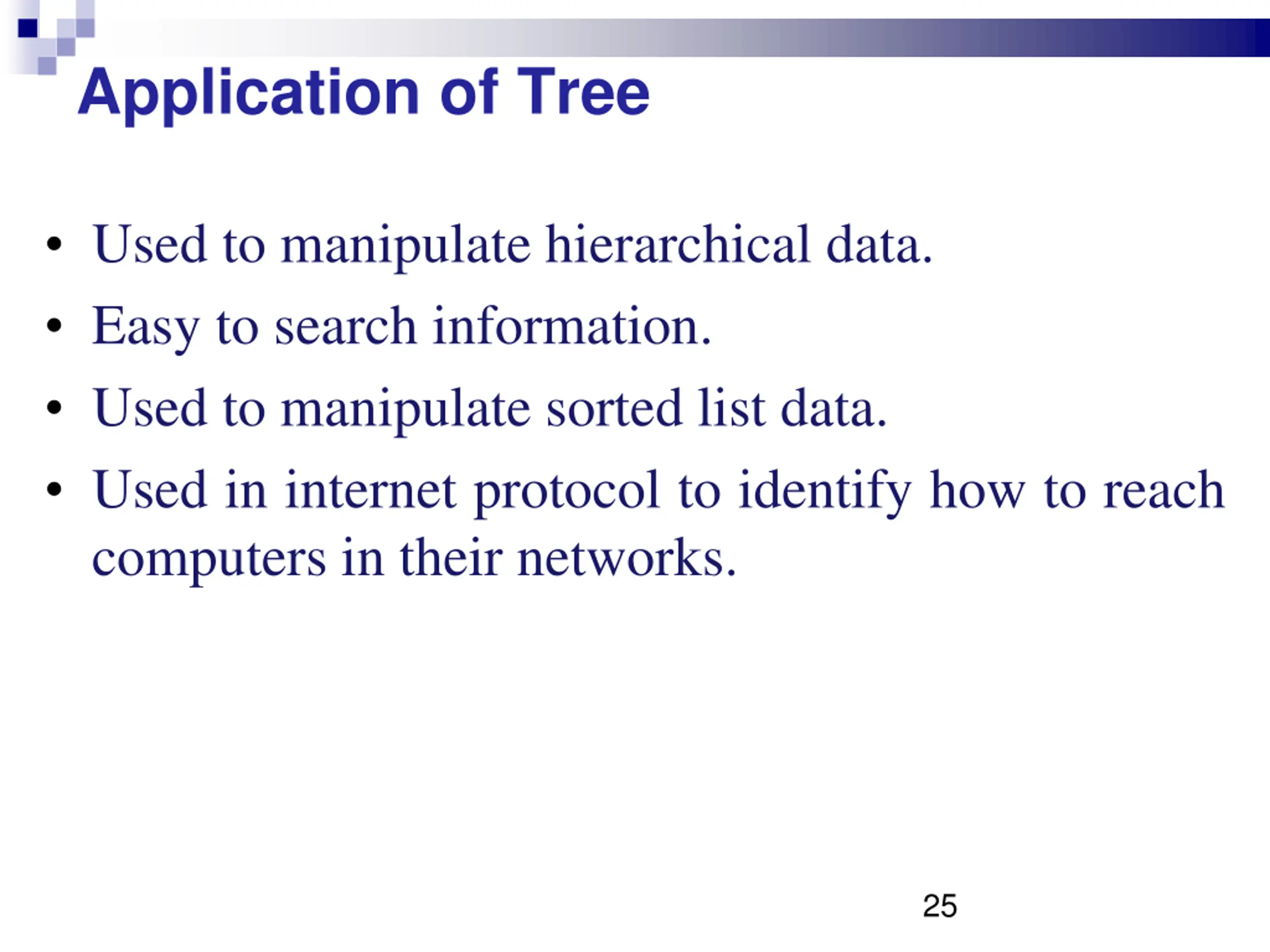 Application of Tree Used to manipulate hierarchical data. Easy to search information. Used to manipulate sorted list data. Used in internet protocol to identify how to reach computers in their networks. 25