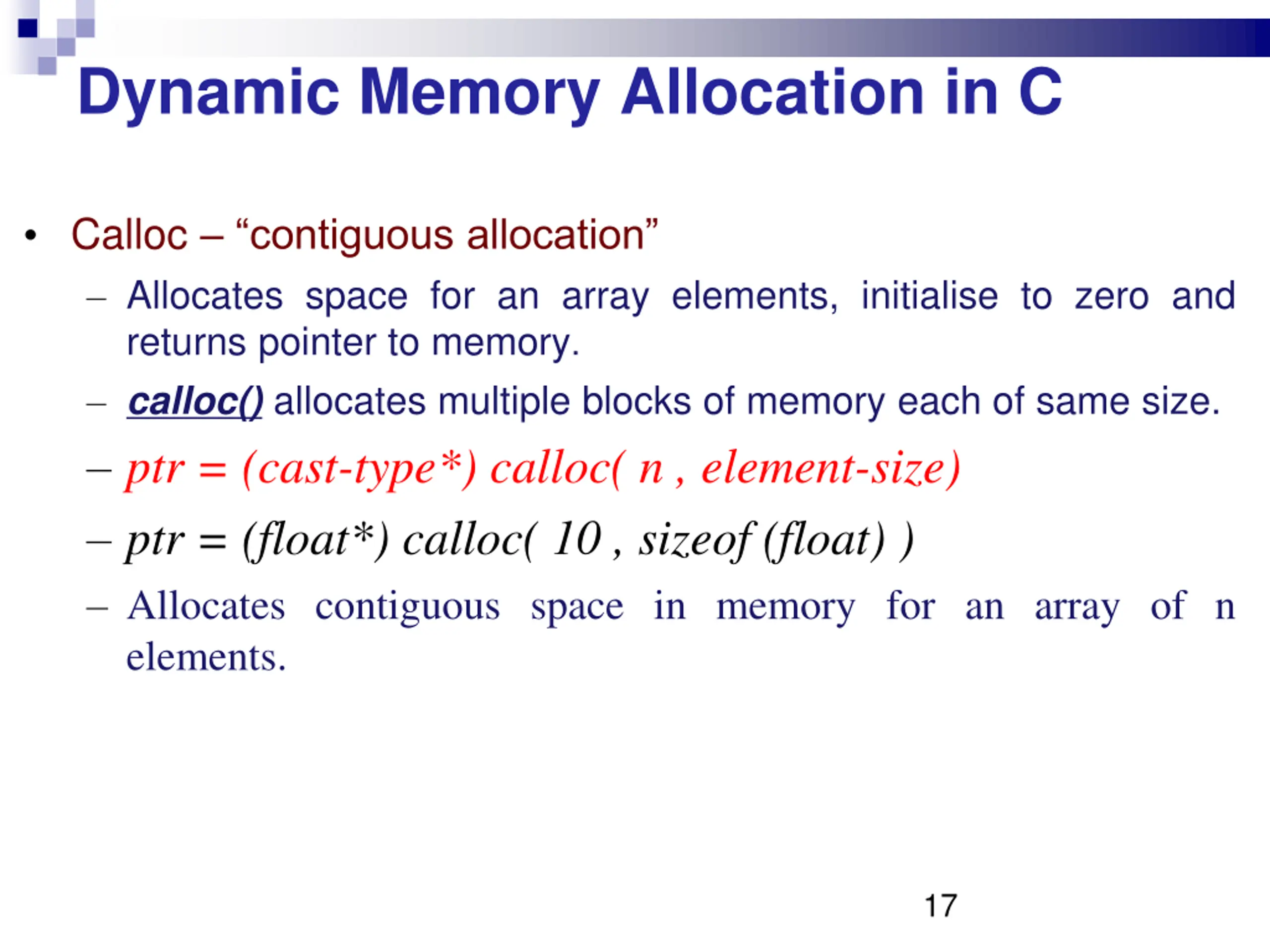 Dynamic Memory Allocation in C Calloc contiguousallocation Allocates space for an array elements, initialise to zero and returns pointer to memory. calloc() allocates multiple blocks of memory each of same size. ptr = (cast-type*) calloc( n , element-size) ptr = (float*) calloc( 10 , sizeof (float) ) Allocates contiguous space in memory for an array of n elements. 17