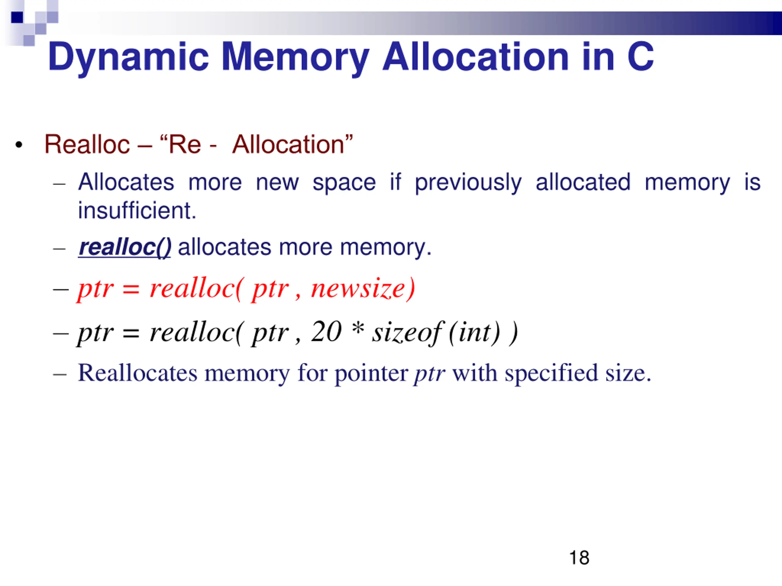 Dynamic Memory Allocation in C Realloc Re - Allocation Allocates more new space if previously allocated memory is insufficient. realloc() allocates more memory. ptr = realloc( ptr , newsize) ptr = realloc( ptr , 20 * sizeof (int) ) Reallocates memory for pointer ptr with specified size. 18