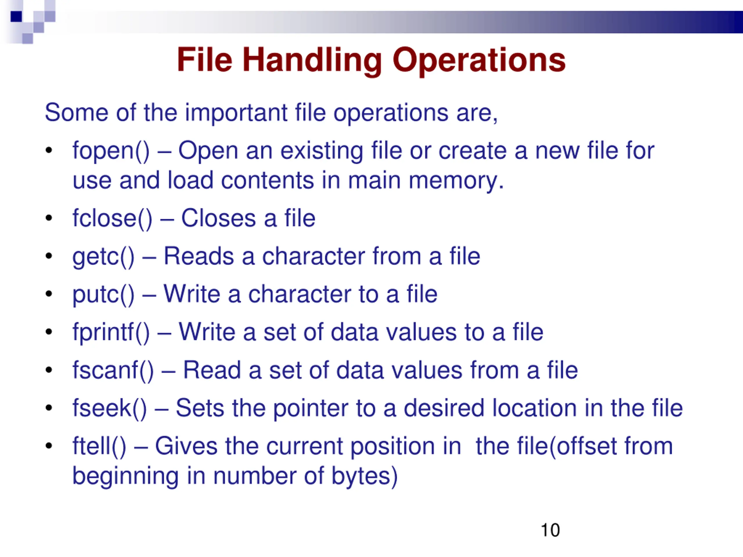 File Handling Operations Some of the important file operations are, fopen() Open an existing file or create a new file for use and load contents in main memory. fclose() Closes a file getc() Reads a character from a file putc() Write a character to a file fprintf() Write a set of data values to a file fscanf() Read a set of data values from a file fseek() Sets the pointer to a desired location in the file ftell() Gives the current position in the file(offset from beginning in number of bytes) 10
