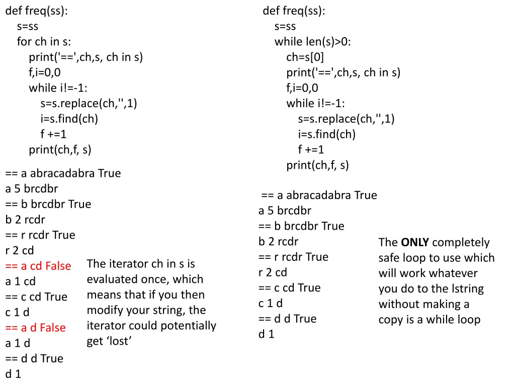 def freq(ss): s=ss for ch in s: print('==',ch,s, ch in s) f,i=0,0 while i!=-1: s=s.replace(ch,'',1) i=s.find(ch) f +=1 print(ch,f, s) def freq(ss): s=ss while len(s)>0: ch=s[0] print('==',ch,s, ch in s) f,i=0,0 while i!=-1: s=s.replace(ch,'',1) i=s.find(ch) f +=1 print(ch,f, s) == a abracadabra True a 5 brcdbr == b brcdbr True b 2 rcdr == r rcdr True r 2 cd == a cd False a 1 cd == c cd True c 1 d == a d False a 1 d == d d True d 1 == a abracadabra True a 5 brcdbr == b brcdbr True b 2 rcdr == r rcdr True r 2 cd == c cd True c 1 d == d d True d 1 The ONLY completely safe loop to use which will work whatever you do to the lstring without making a copy is a while loop The iterator ch in s is evaluated once, which means that if you then modify your string, the iterator could potentially get lost