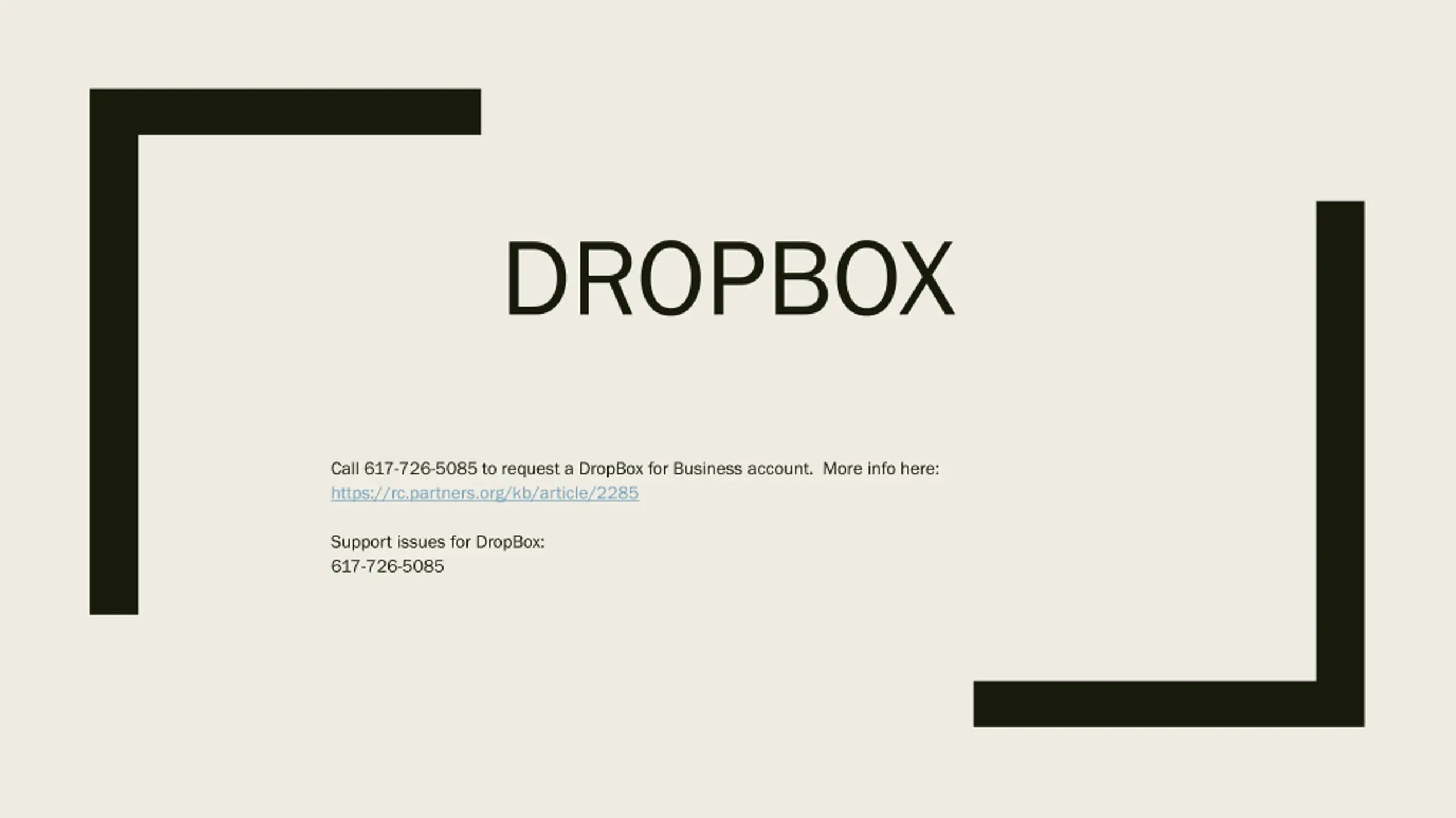 DROPBOX Call 617-726-5085 to request a DropBox for Business account. More info here: https://rc.partners.org/kb/article/2285 Support issues for DropBox: 617-726-5085