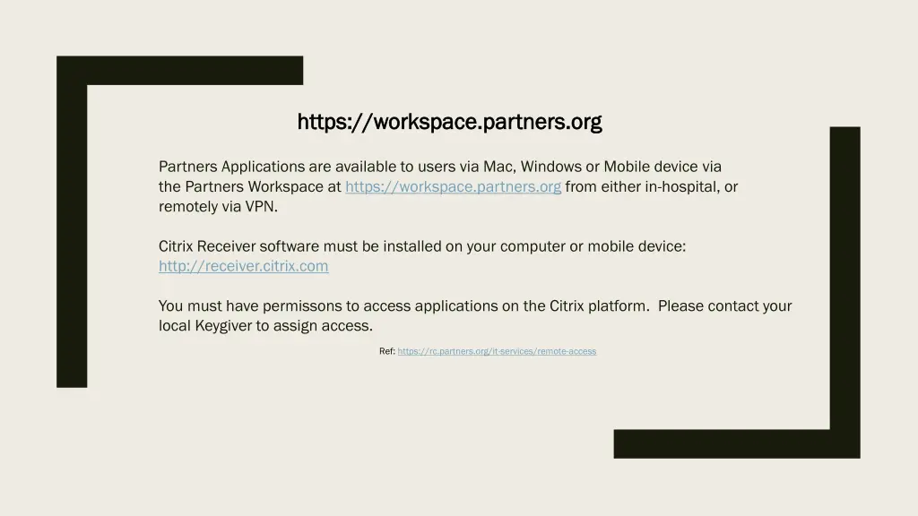 https://workspace.partners.org https://workspace.partners.org Partners Applications are available to users via Mac, Windows or Mobile device via the Partners Workspace at https://workspace.partners.org from either in-hospital, or remotely via VPN. Citrix Receiver software must be installed on your computer or mobile device: http://receiver.citrix.com You must have permissons to access applications on the Citrix platform. Please contact your local Keygiver to assign access. Ref: https://rc.partners.org/it-services/remote-access