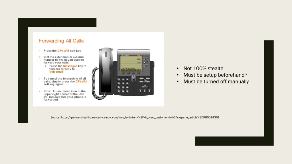 Not 100% stealth Must be setup beforehand* Must be turned off manually Source: https://partnershealthcare.service-now.com/nav_to.do?uri=%2Fkb_view_customer.do%3Fsysparm_article%3DKB0014361