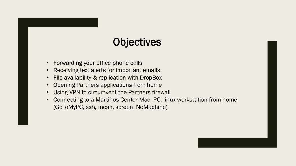 Objectives Objectives Forwarding your office phone calls Receiving text alerts for important emails File availability & replication with DropBox Opening Partners applications from home Using VPN to circumvent the Partners firewall Connecting to a Martinos Center Mac, PC, linux workstation from home (GoToMyPC, ssh, mosh, screen, NoMachine)