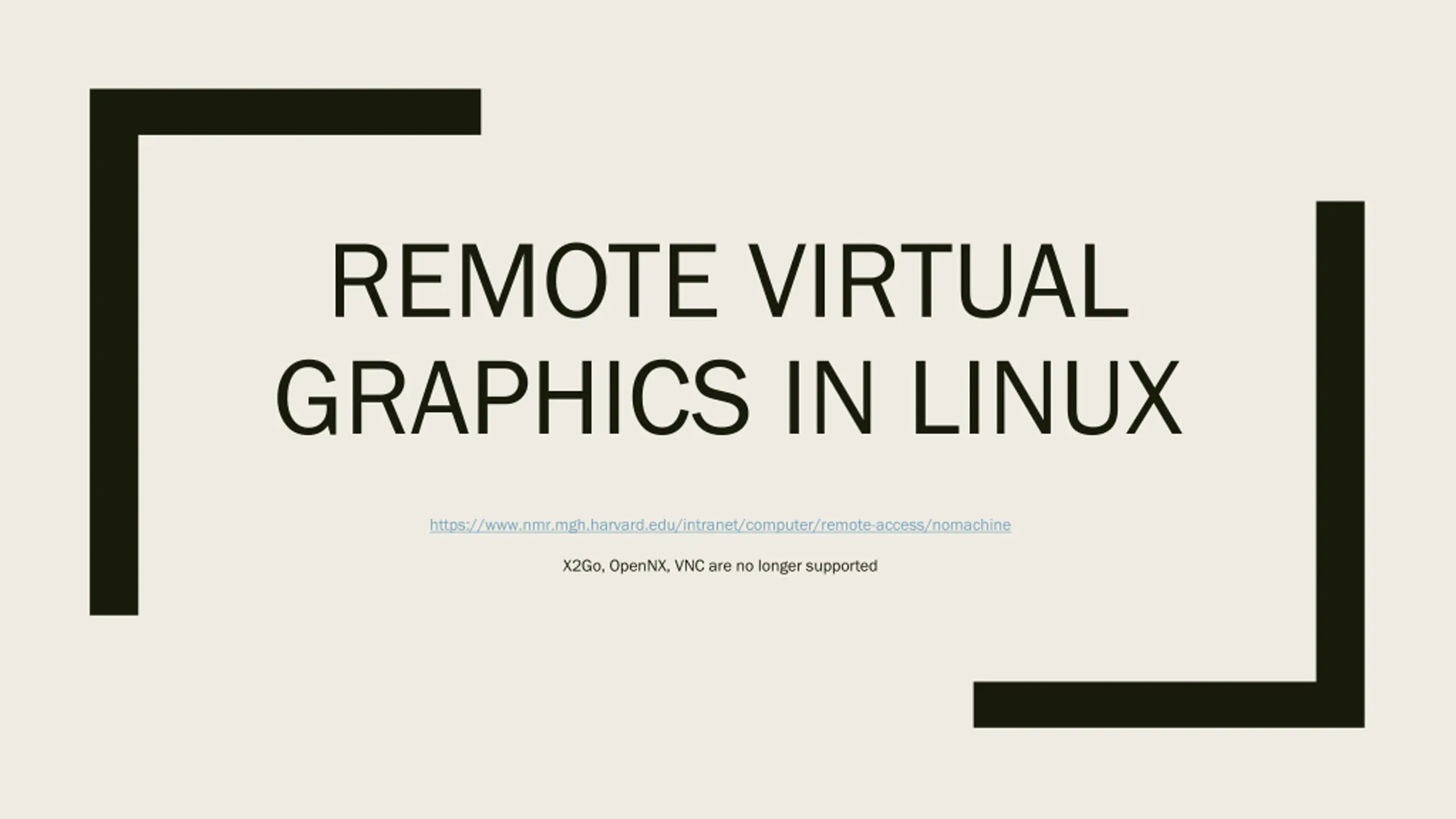 REMOTE VIRTUAL GRAPHICS IN LINUX https://www.nmr.mgh.harvard.edu/intranet/computer/remote-access/nomachine X2Go, OpenNX, VNC are no longer supported
