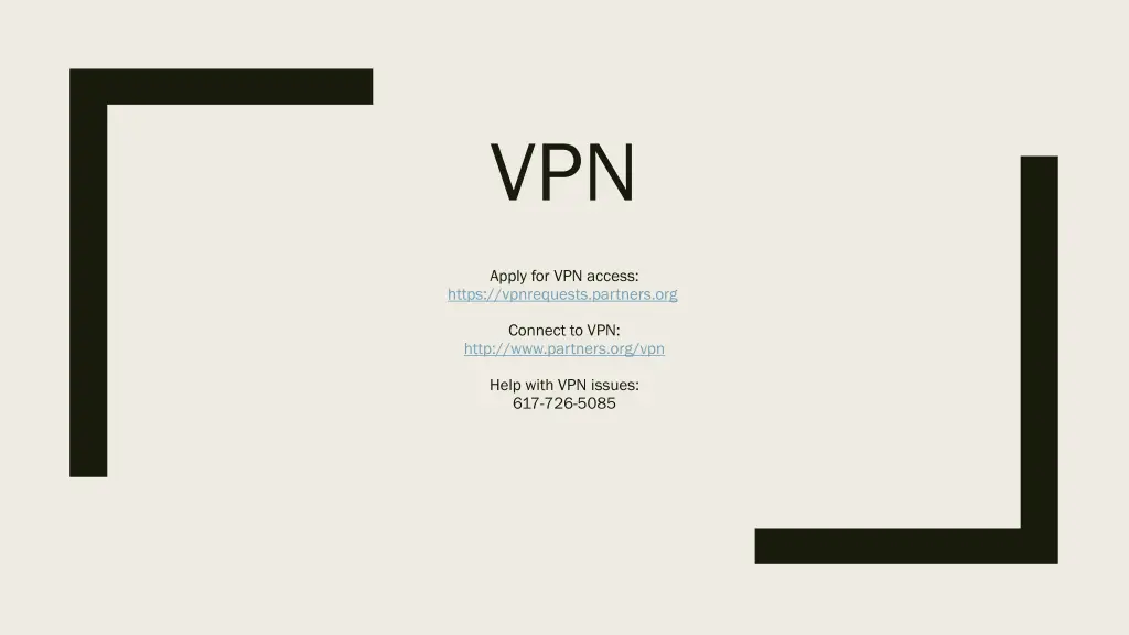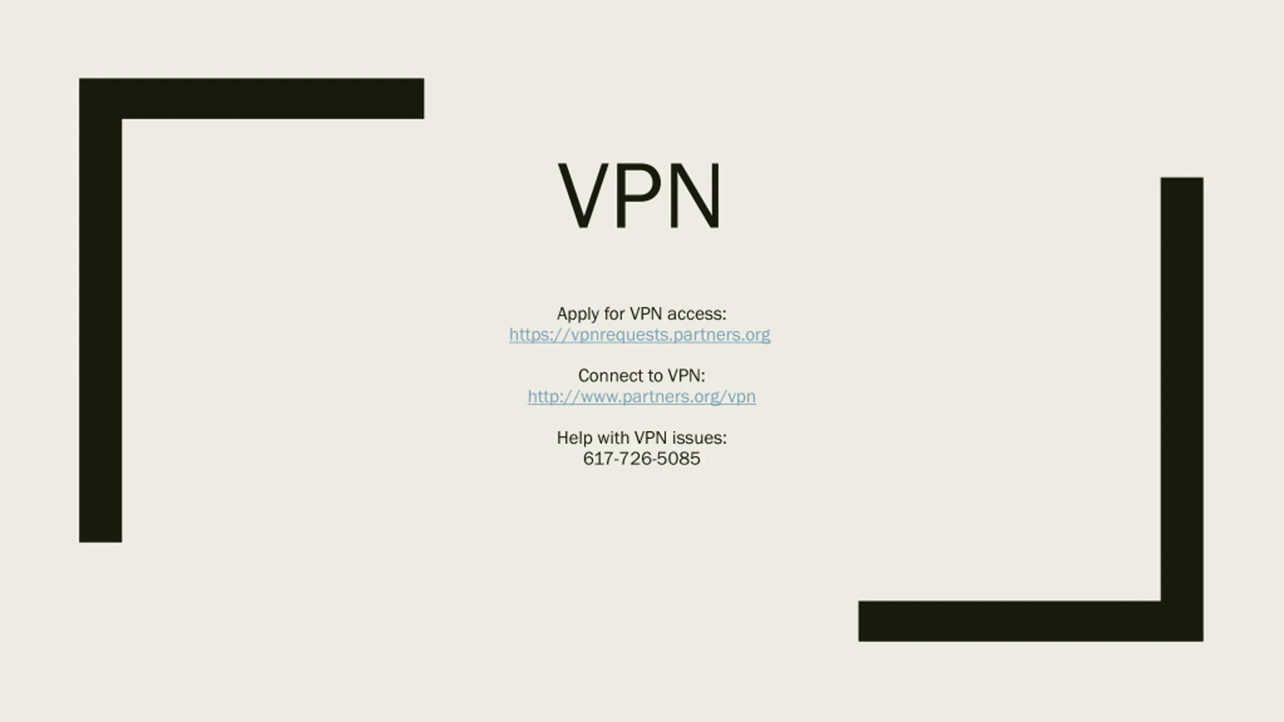VPN Apply for VPN access: https://vpnrequests.partners.org Connect to VPN: http://www.partners.org/vpn Help with VPN issues: 617-726-5085