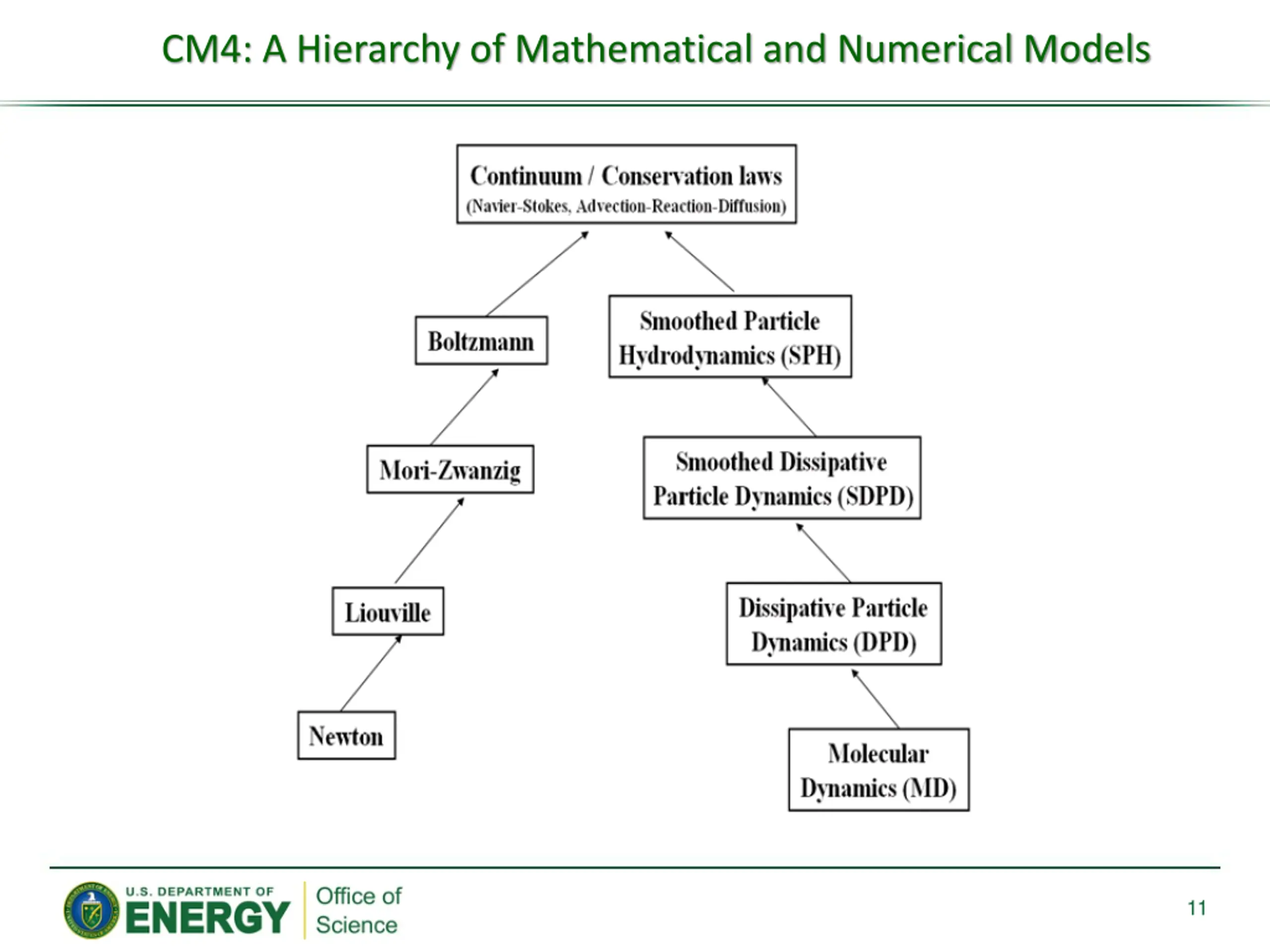 Collaboratory of Mathematics for Mesoscopic Modeling of Materials (CM4) Project Director: George Karniadakis, Pacific Northwest National Lab Goals: Develop mathematical foundations for understanding and control of fundamental mechanisms in mesoscale processes. Accurate multiscale simulations require understanding the formal relation between different length and time scales Mathematical challenges include the development of (1) system reduction, (2) sampling, (3) filtering and (4) projection techniques Integrated Novel Mathematics Research: Computational approaches at mesoscale: Particle-based methods (bottom-up) Grid-based methods (top-down) Stochastic methods for modeling randomness and for UQ at all scales Concurrent couplings to provide descriptions across scales. Use Mori-Zwanzig formulation to derive new governing equations for coarse-graining. Long-Term DOE Impact: Develop a hierarchy of mathematical models and numerical approaches to seamlessly model and simulate a system from the molecular to the macroscopic scale. Addresses a broad class of applications such as control of chemical reactions in combustion and catalysis, reactive flow in complex liquids, and the formation of new energy storage materials. Sketch illustrating the range of mesoscale phenomena and their connection to molecular and continuum-based description. Team: Pacific Northwest National Lab (Lead), Sandia National Lab, Brown University, University of Minnesota, Princeton University, Stanford University, UC Santa Barbara , Pennsylvania State University 10