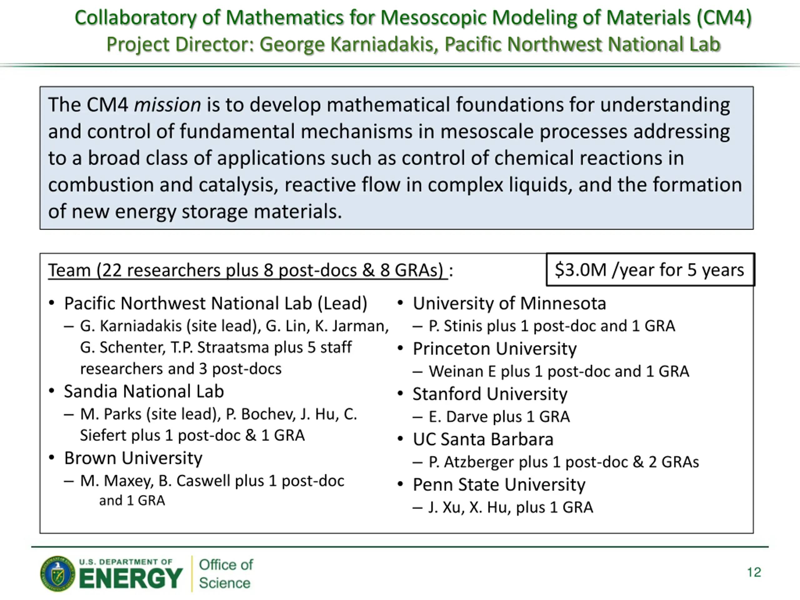 Collaboratory of Mathematics for Mesoscopic Modeling of Materials (CM4) Project Director: George Karniadakis, Pacific Northwest National Lab The CM4 mission is to develop mathematical foundations for understanding and control of fundamental mechanisms in mesoscale processes addressing to a broad class of applications such as control of chemical reactions in combustion and catalysis, reactive flow in complex liquids, and the formation of new energy storage materials. $3.0M /year for 5 years Team (22 researchers plus 8 post-docs & 8 GRAs) : Pacific Northwest National Lab (Lead) G. Karniadakis (site lead), G. Lin, K. Jarman, G. Schenter, T.P. Straatsma plus 5 staff researchers and 3 post-docs Sandia National Lab M. Parks (site lead), P. Bochev, J. Hu, C. Siefert plus 1 post-doc & 1 GRA Brown University M. Maxey, B. Caswell plus 1 post-doc and 1 GRA University of Minnesota P. Stinis plus 1 post-doc and 1 GRA Princeton University Weinan E plus 1 post-doc and 1 GRA Stanford University E. Darve plus 1 GRA UC Santa Barbara P. Atzberger plus 1 post-doc & 2 GRAs Penn State University J. Xu, X. Hu, plus 1 GRA 12