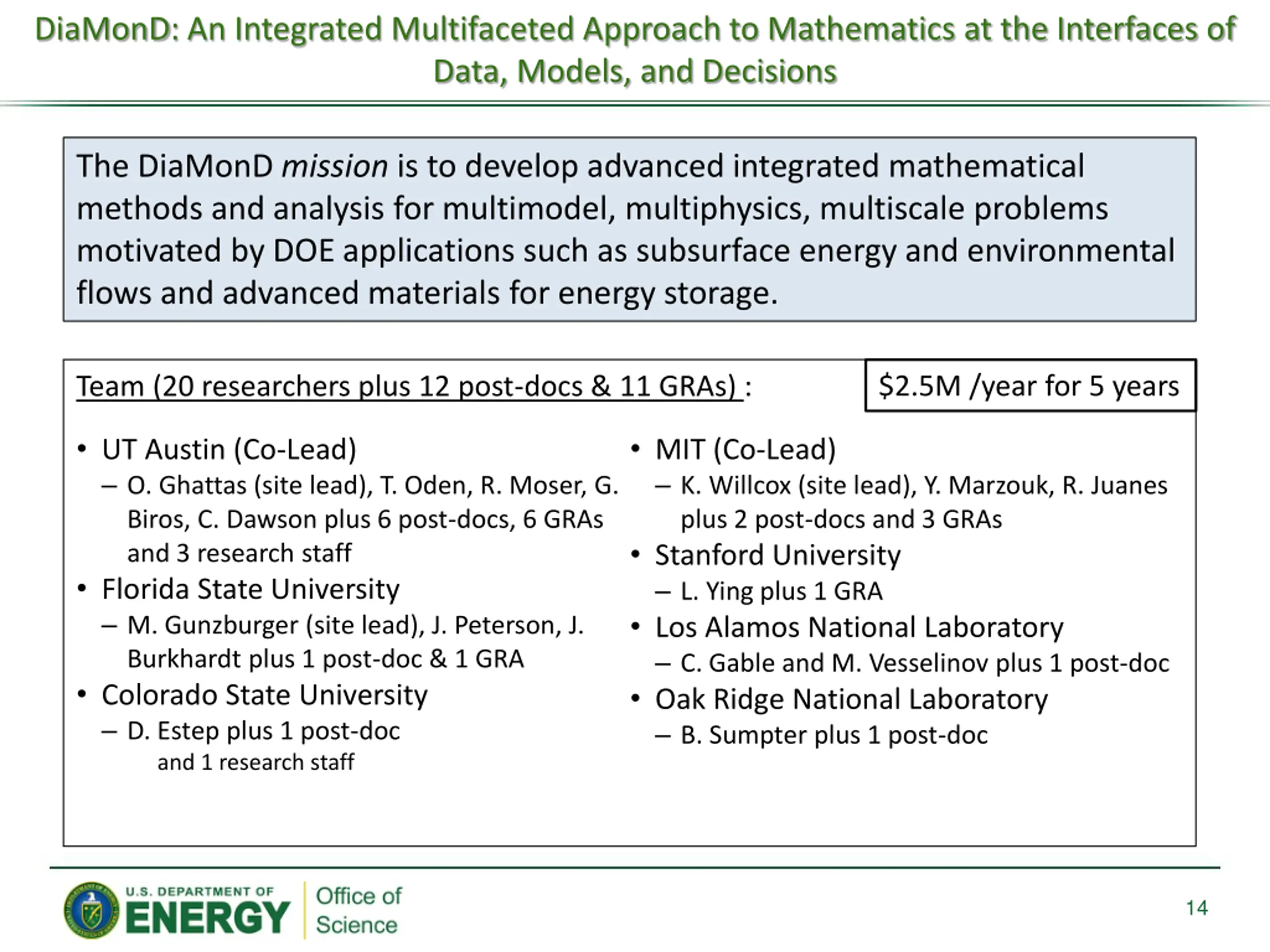 DiaMonD: An Integrated Multifaceted Approach to Mathematics at the Interfaces of Data, Models, and Decisions Project Directors: Omar Ghattas (UT-Austin) and Karen Willcox (MIT) Goals: Addresses the mathematical challenges of end- to-end modeling and simulation for complex DOE problems by considering multi-scale, multi- physics methods, uncertainty quantification, optimization and design, inverse problems and data fusion. Nine core applied mathematics research thrusts and six cross-cutting themes identified. Integrated Novel Mathematics Research: Ultimate goal of supporting decision-making includes integrated approach to: Solving an inverse problem Solving an optimal design problem Solving a control problem Quantifying uncertainties from data to model inference to prediction and finally to optimal design and control. Long-Term DOE Impact: Mathematics addresses a broad class of applications such as subsurface flows, including both CO2 sequestration and contaminant transport, and materials for energy storage and conversion, e.g. fuel cells. Team: University of Texas at Austin (Co-Lead), MIT (Co-Lead), Colorado State University, Florida State University, Stanford, Los Alamos National Lab, Oak Ridge National Lab 13