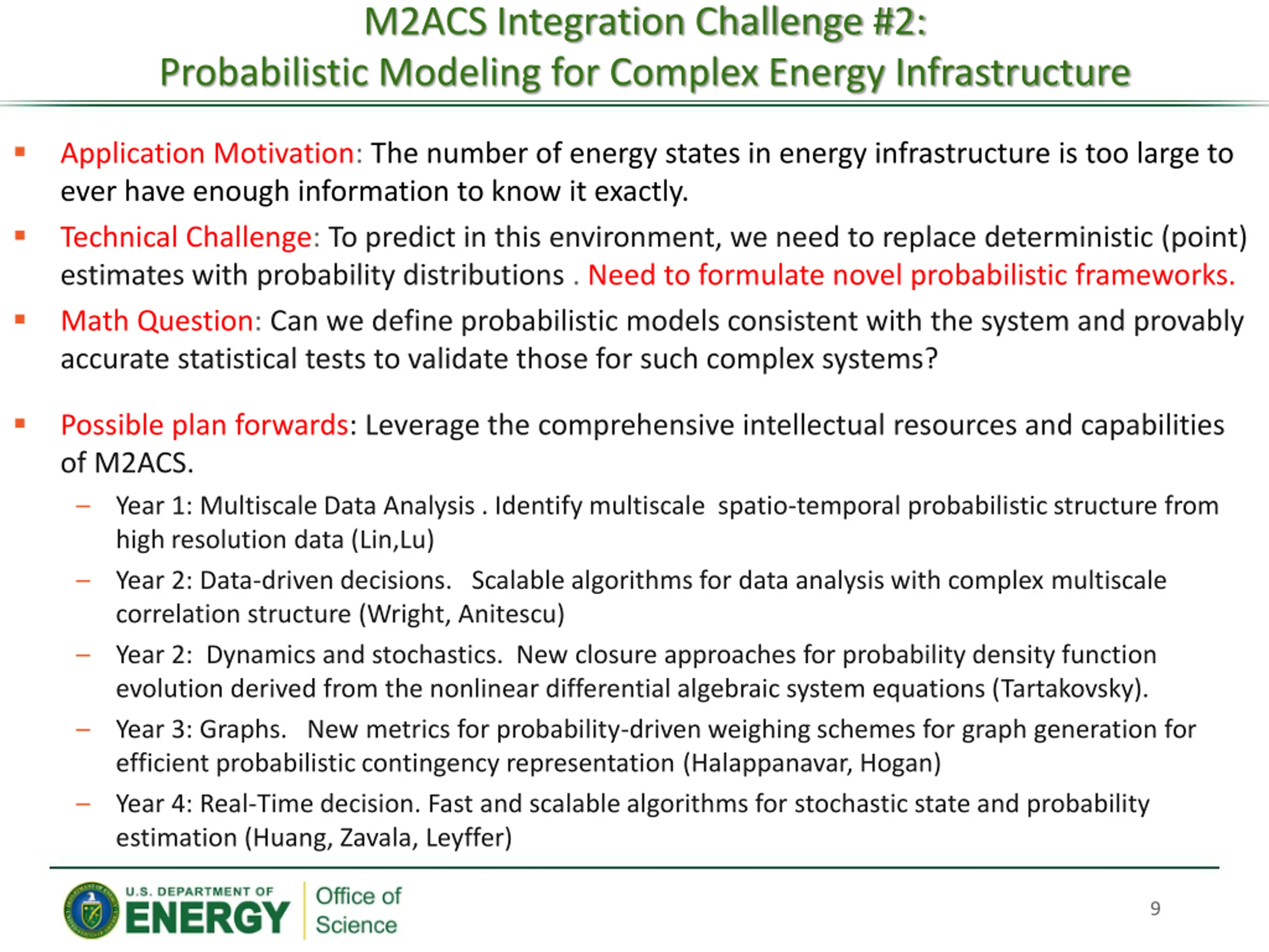 M2ACS Integration Challenge #2: Probabilistic Modeling for Complex Energy Infrastructure Application Motivation: The number of energy states in energy infrastructure is too large to ever have enough information to know it exactly. Technical Challenge: To predict in this environment, we need to replace deterministic (point) estimates with probability distributions . Need to formulate novel probabilistic frameworks. Math Question: Can we define probabilistic models consistent with the system and provably accurate statistical tests to validate those for such complex systems? Possible plan forwards: Leverage the comprehensive intellectual resources and capabilities of M2ACS. Year 1: Multiscale Data Analysis . Identify multiscale spatio-temporal probabilistic structure from high resolution data (Lin,Lu) Year 2: Data-driven decisions. Scalable algorithms for data analysis with complex multiscale correlation structure (Wright, Anitescu) Year 2: Dynamics and stochastics. New closure approaches for probability density function evolution derived from the nonlinear differential algebraic system equations (Tartakovsky). Year 3: Graphs. New metrics for probability-driven weighing schemes for graph generation for efficient probabilistic contingency representation (Halappanavar, Hogan) Year 4: Real-Time decision. Fast and scalable algorithms for stochastic state and probability estimation (Huang, Zavala, Leyffer) 9