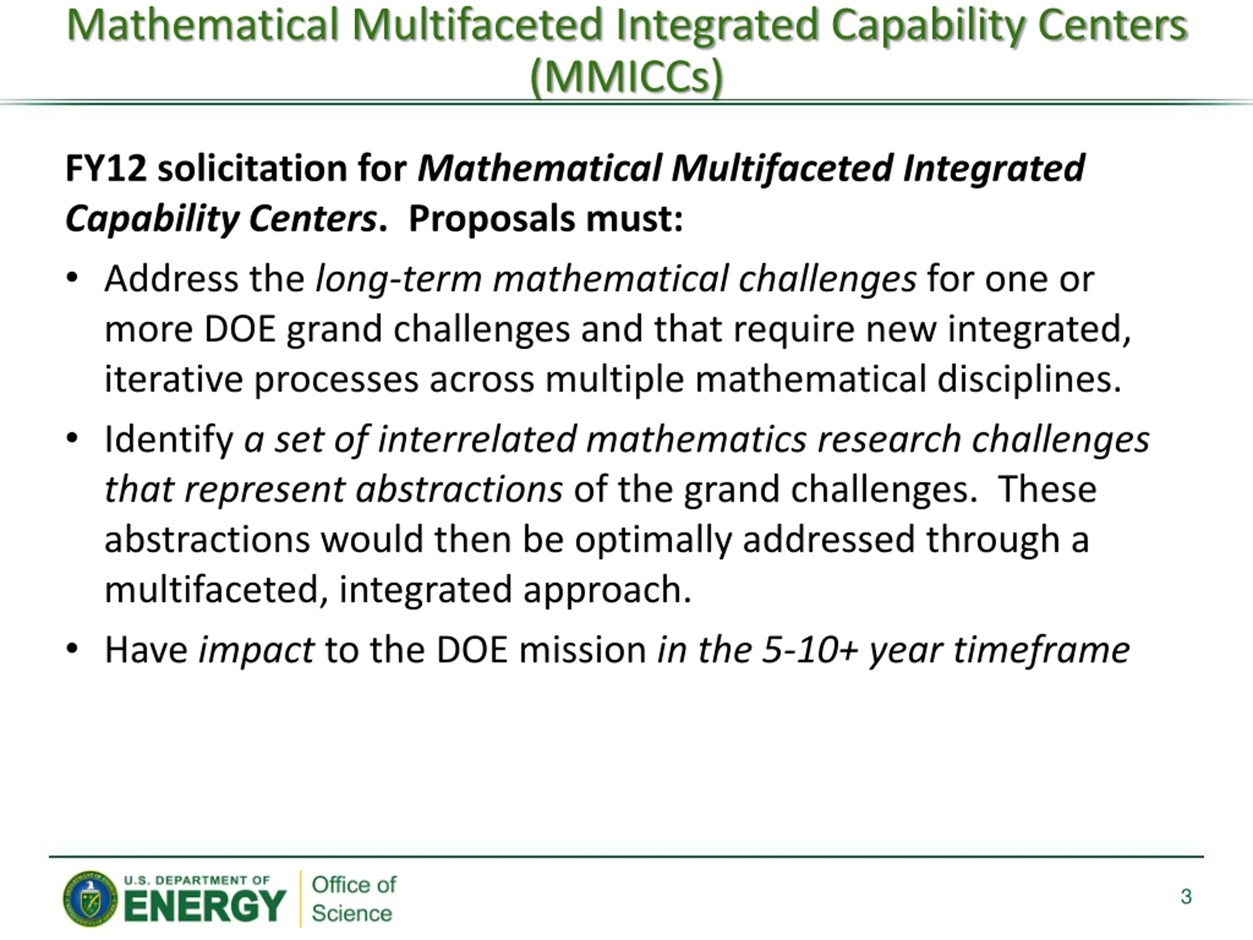 Mathematical Multifaceted Integrated Capability Centers (MMICCs) FY12 solicitation for Mathematical Multifaceted Integrated Capability Centers. Proposals must: Address the long-term mathematical challenges for one or more DOE grand challenges and that require new integrated, iterative processes across multiple mathematical disciplines. Identify a set of interrelated mathematics research challenges that represent abstractions of the grand challenges. These abstractions would then be optimally addressed through a multifaceted, integrated approach. Have impact to the DOE mission in the 5-10+ year timeframe 3