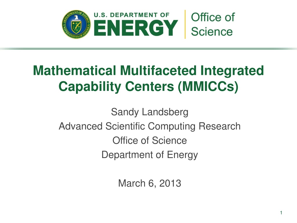 Mathematical Multifaceted Integrated Capability Centers (MMICCs) Sandy Landsberg Advanced Scientific Computing Research Office of Science Department of Energy March 6, 2013 1