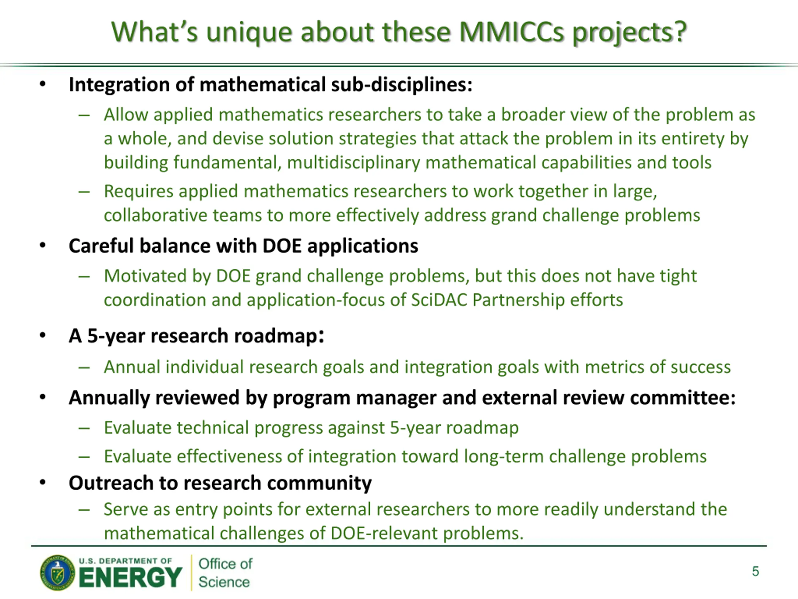 Whats unique about these MMICCs projects? Integration of mathematical sub-disciplines: Allow applied mathematics researchers to take a broader view of the problem as a whole, and devise solution strategies that attack the problem in its entirety by building fundamental, multidisciplinary mathematical capabilities and tools Requires applied mathematics researchers to work together in large, collaborative teams to more effectively address grand challenge problems Careful balance with DOE applications Motivated by DOE grand challenge problems, but this does not have tight coordination and application-focus of SciDAC Partnership efforts A 5-year research roadmap: Annual individual research goals and integration goals with metrics of success Annually reviewed by program manager and external review committee: Evaluate technical progress against 5-year roadmap Evaluate effectiveness of integration toward long-term challenge problems Outreach to research community Serve as entry points for external researchers to more readily understand the mathematical challenges of DOE-relevant problems. 5