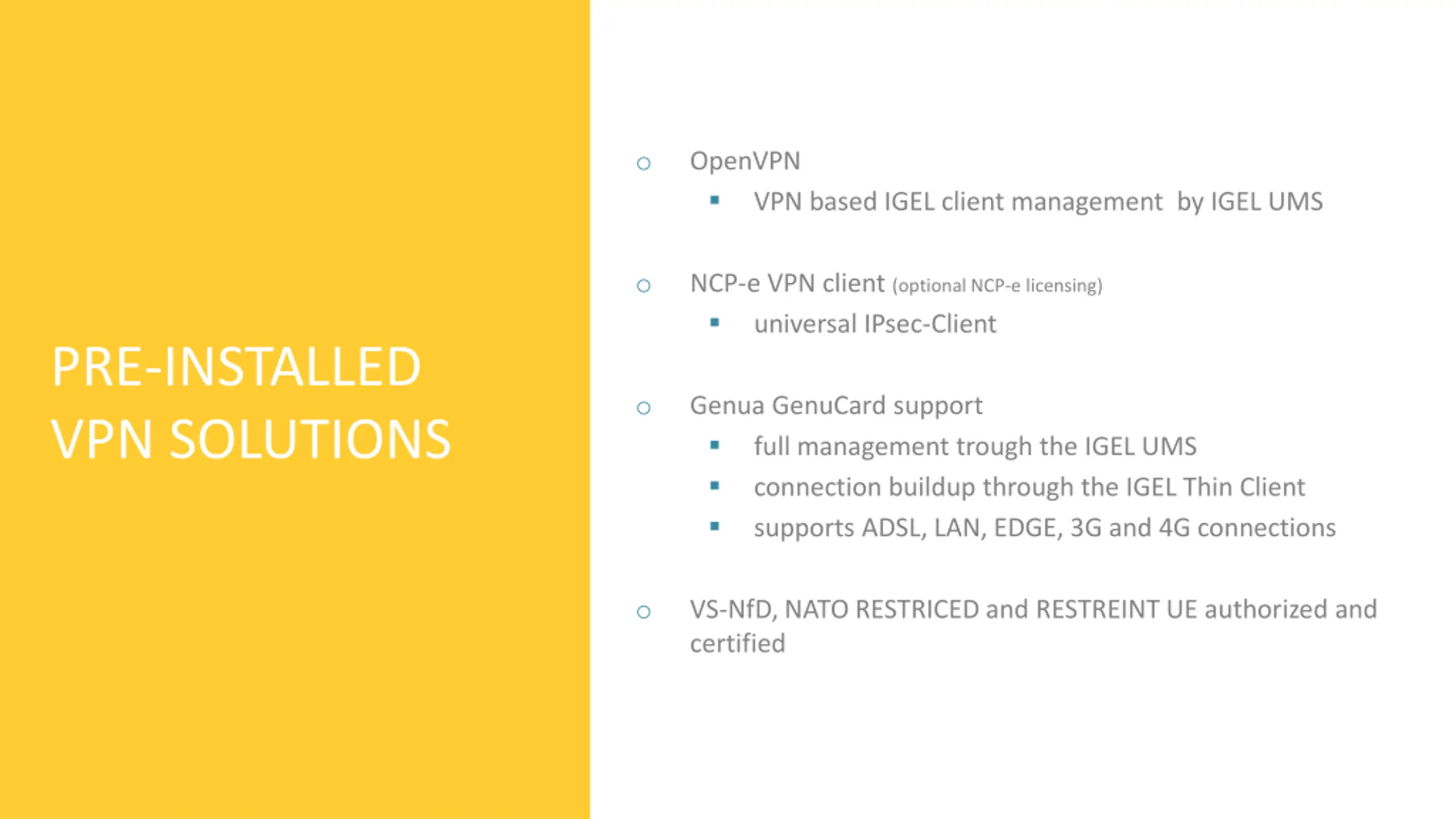 o OpenVPN VPN based IGEL client management by IGEL UMS o NCP-e VPN client (optional NCP-e licensing) universal IPsec-Client PRE-INSTALLED VPN SOLUTIONS o Genua GenuCard support full management trough the IGEL UMS connection buildup through the IGEL Thin Client supports ADSL, LAN, EDGE, 3G and 4G connections o VS-NfD, NATO RESTRICED and RESTREINT UE authorized and certified