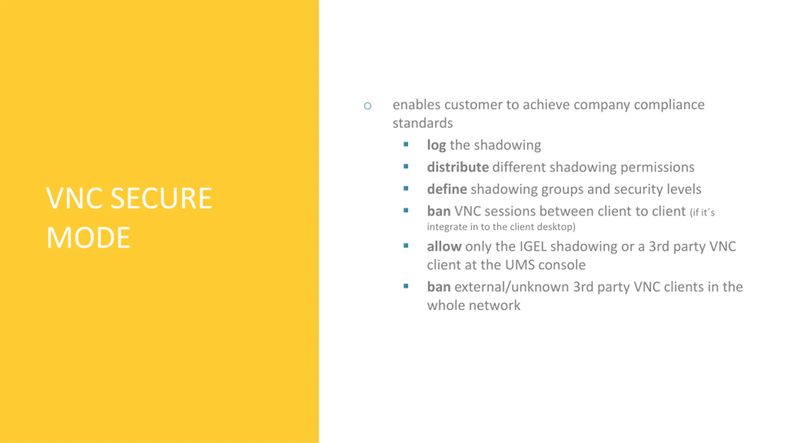 o enables customer to achieve company compliance standards log the shadowing distribute different shadowing permissions define shadowing groups and security levels ban VNC sessions between client to client (if it s integrate in to the client desktop) allow only the IGEL shadowing or a 3rd party VNC client at the UMS console ban external/unknown 3rd party VNC clients in the whole network VNC SECURE MODE
